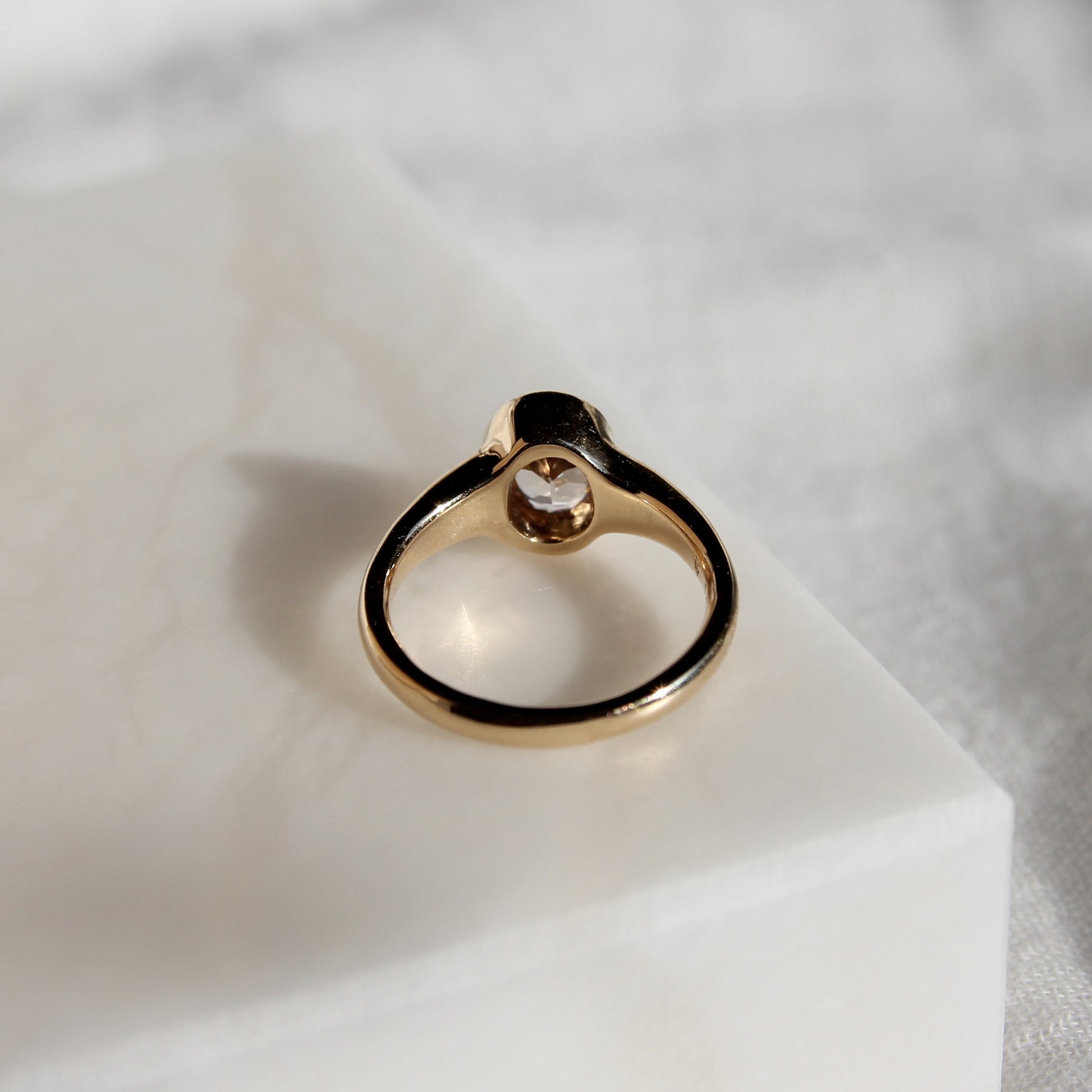 This 1.27ct Sri Lankan origin pale pink sapphire ring is set in a hand carved 14k yellow gold mount. 6 x Canadian round brilliant cut white diamonds sparkle on its shoulders.