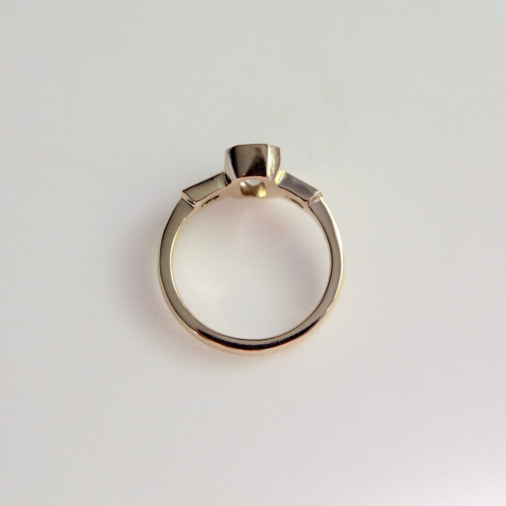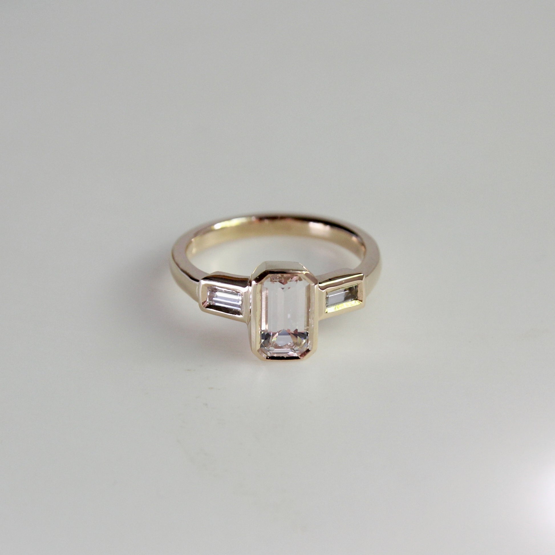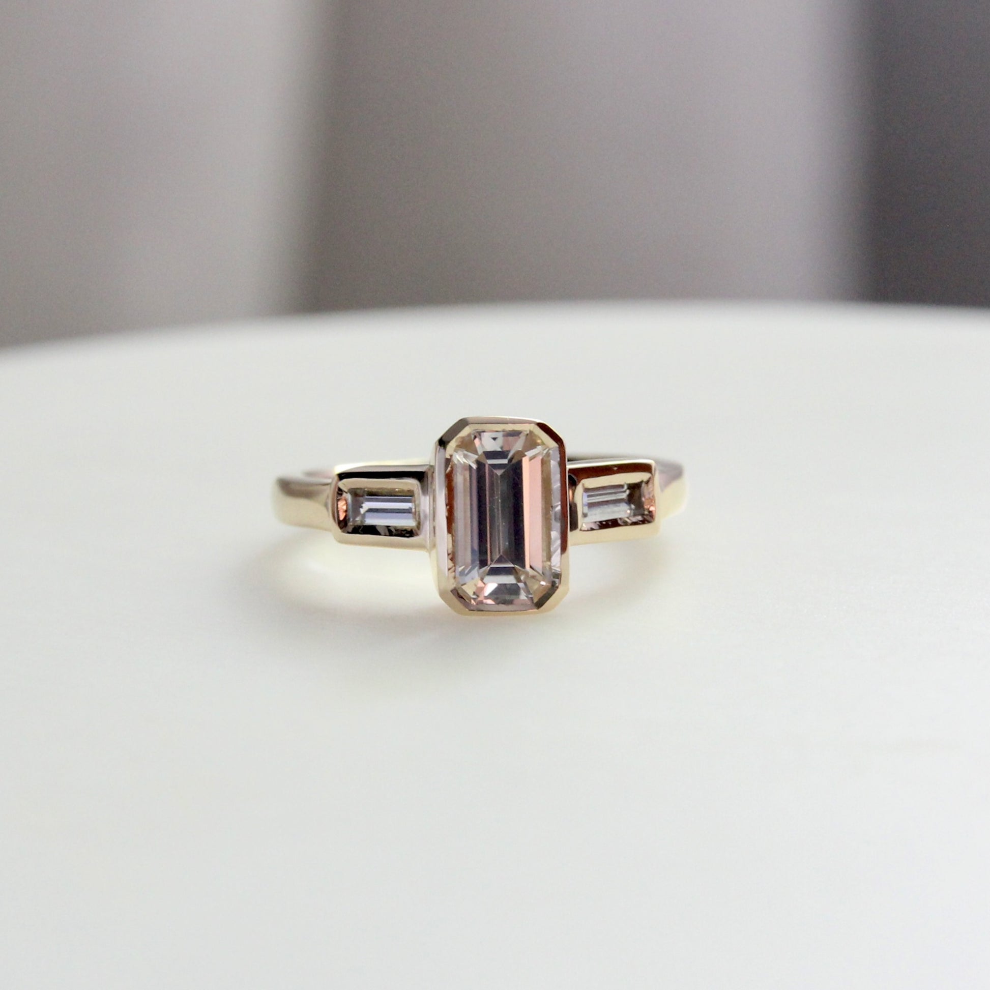 This one of a kind, hand carved trilogy ring features a 1.30ct Sri Lankan white sapphire centre stone with straight baguette shoulders.