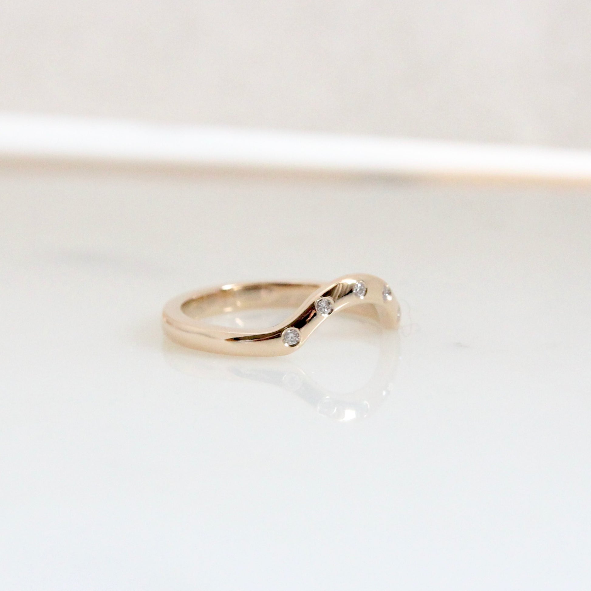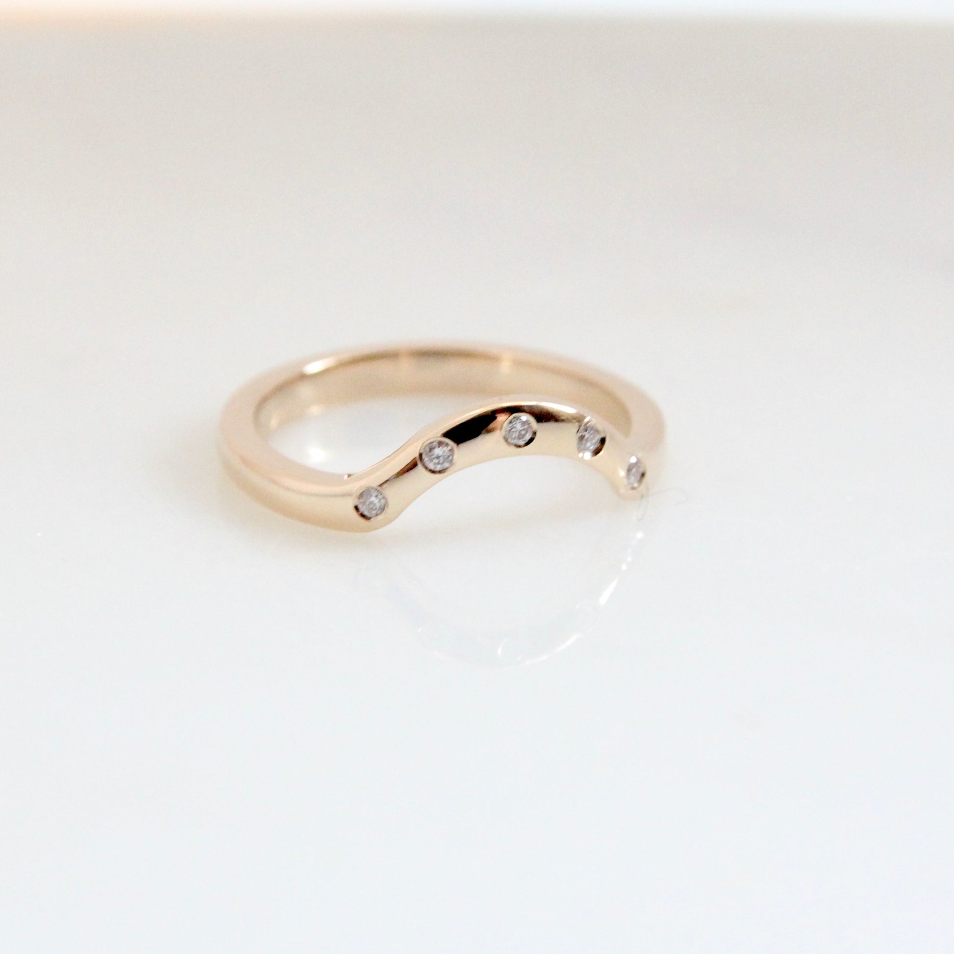 2mm wide and dotted with 5 x round brilliant cut Canadian diamonds, this wedding band isn't like your usual. Made to order in 14k yellow gold.