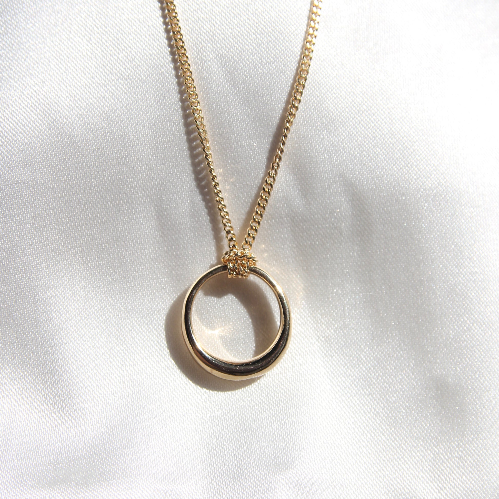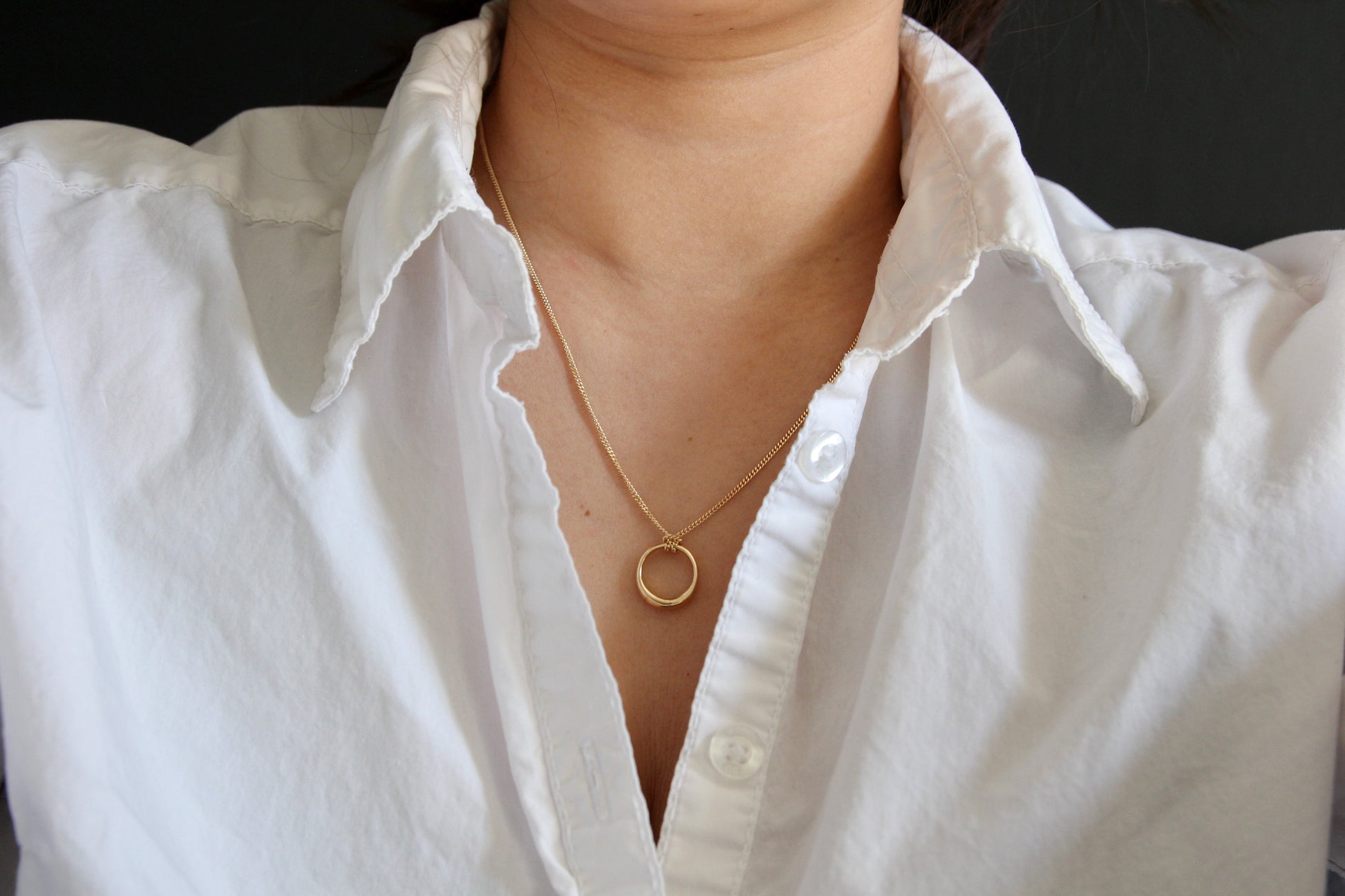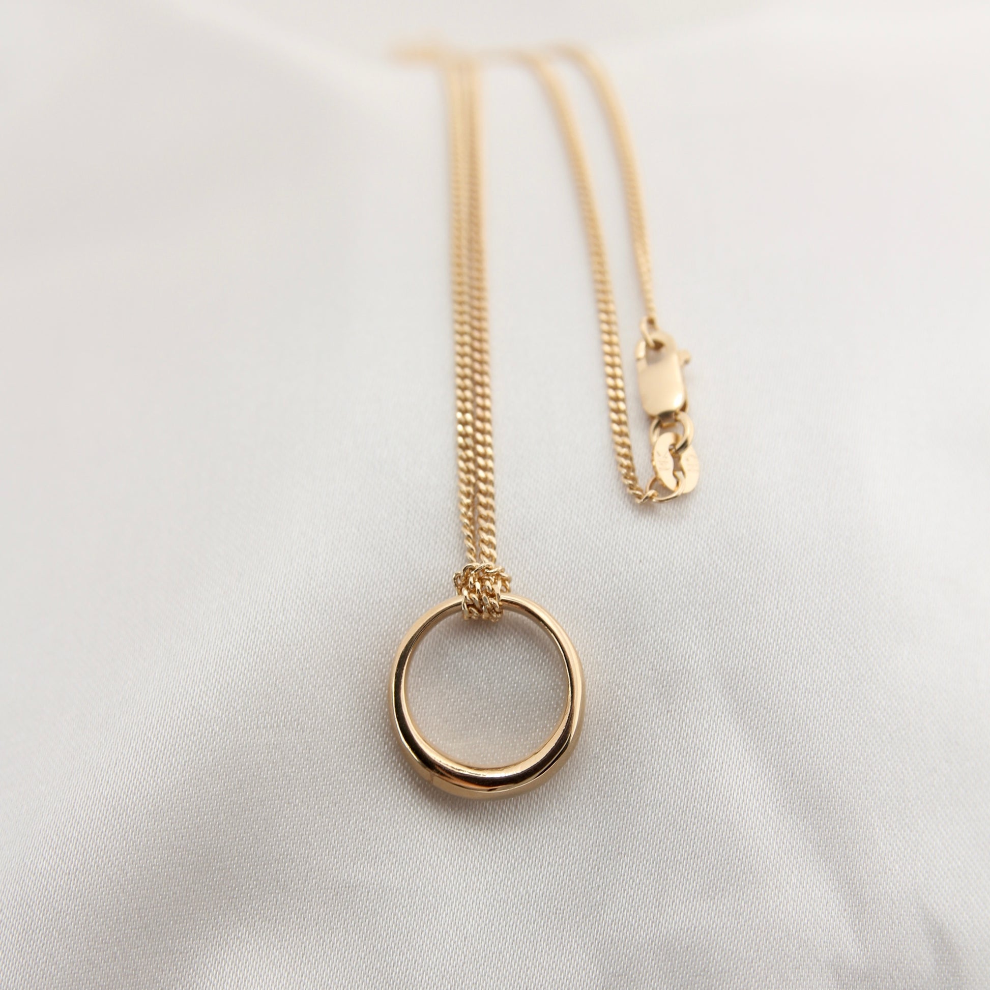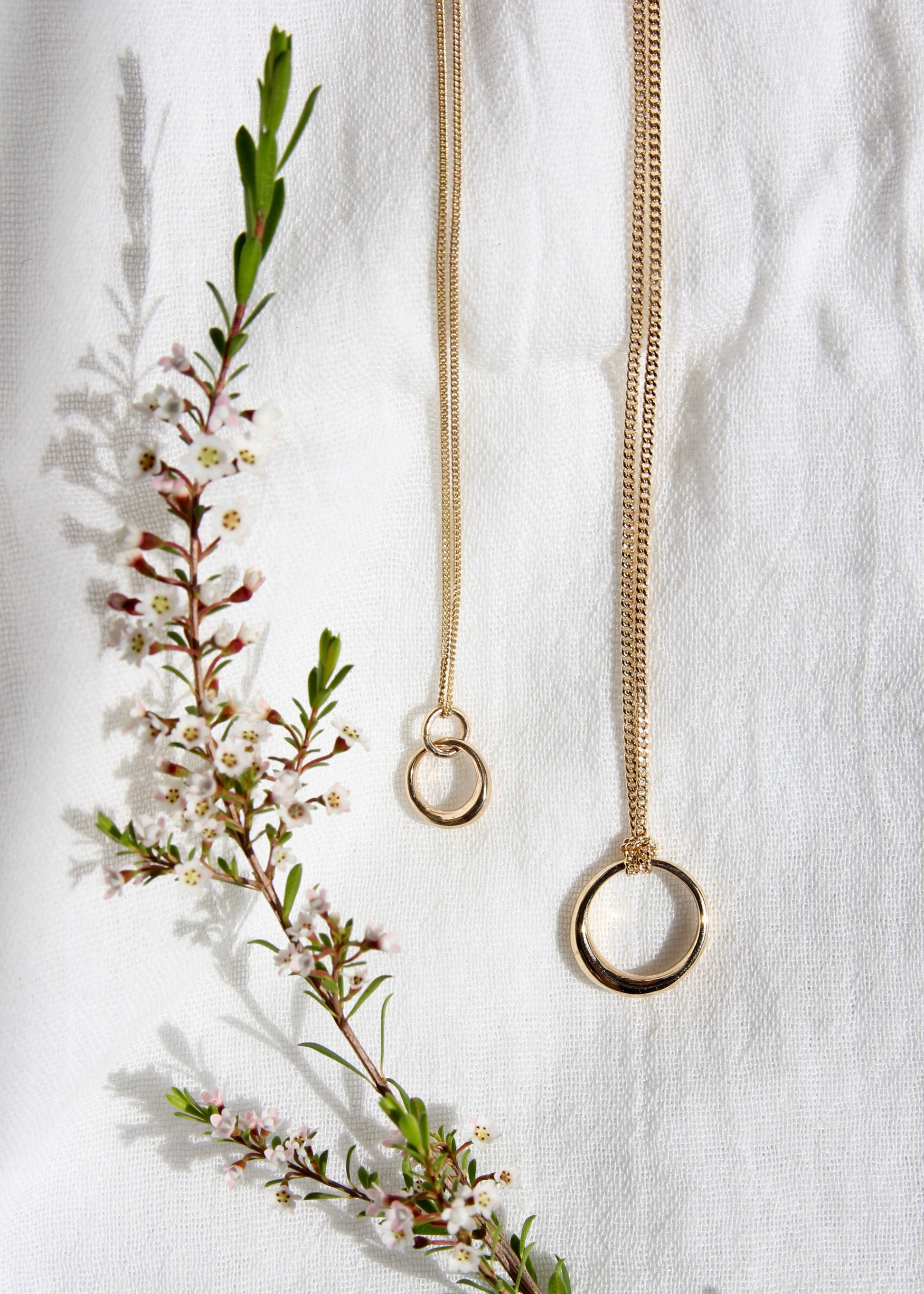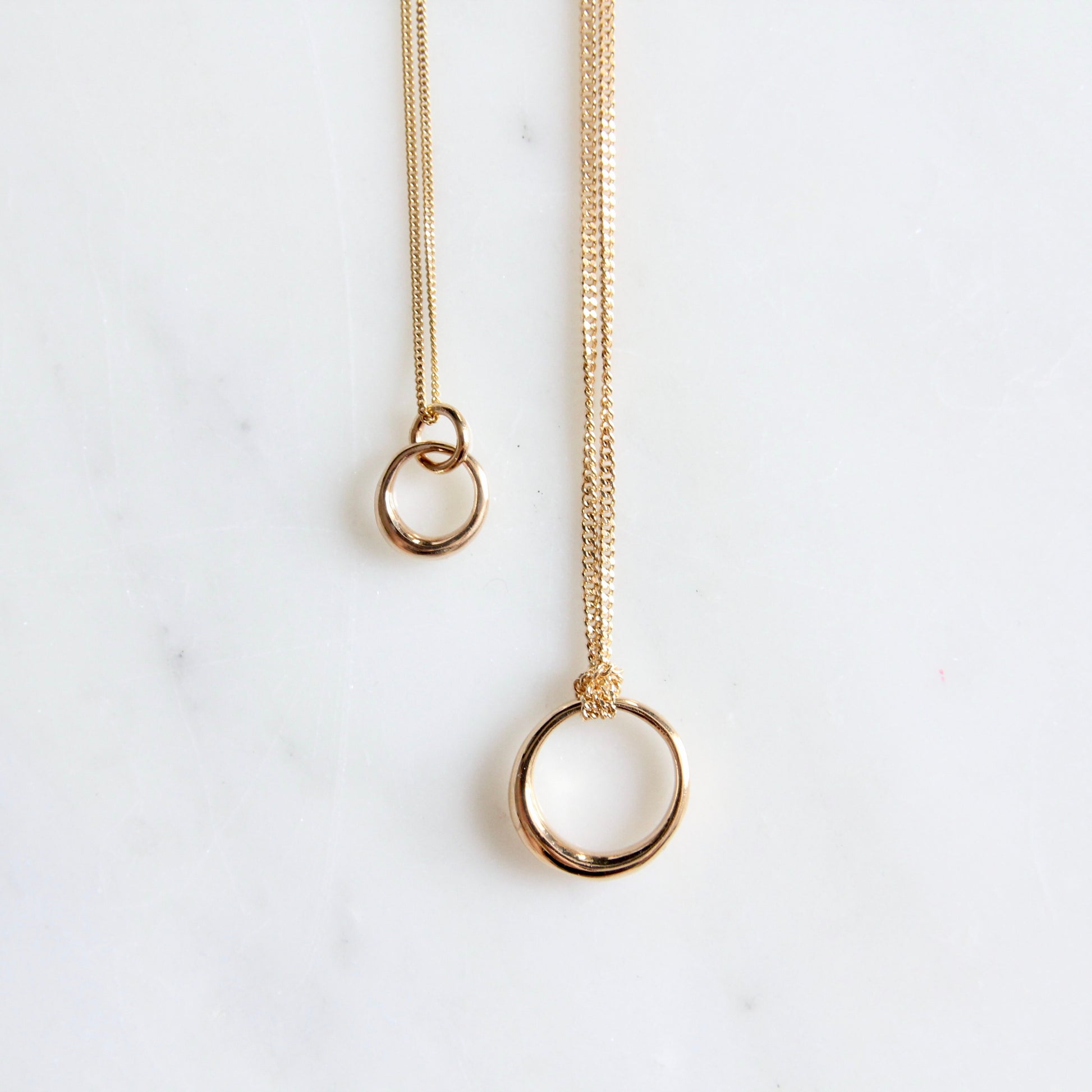 Our Aura form in a bolder piece. You can wear this necklace two ways, looped and fixed in place, or sliding on the chain.