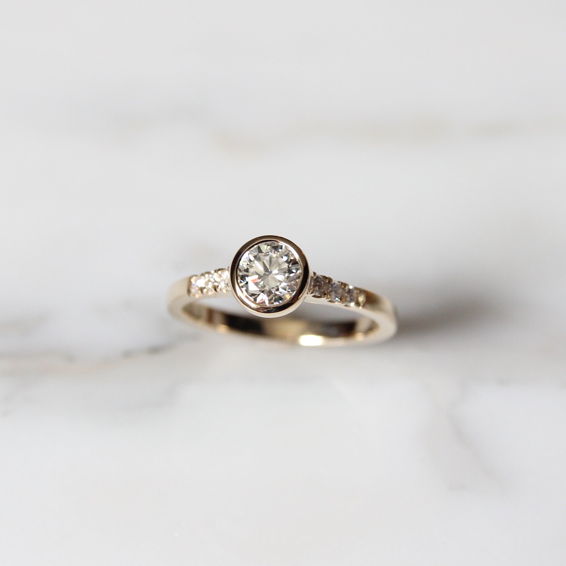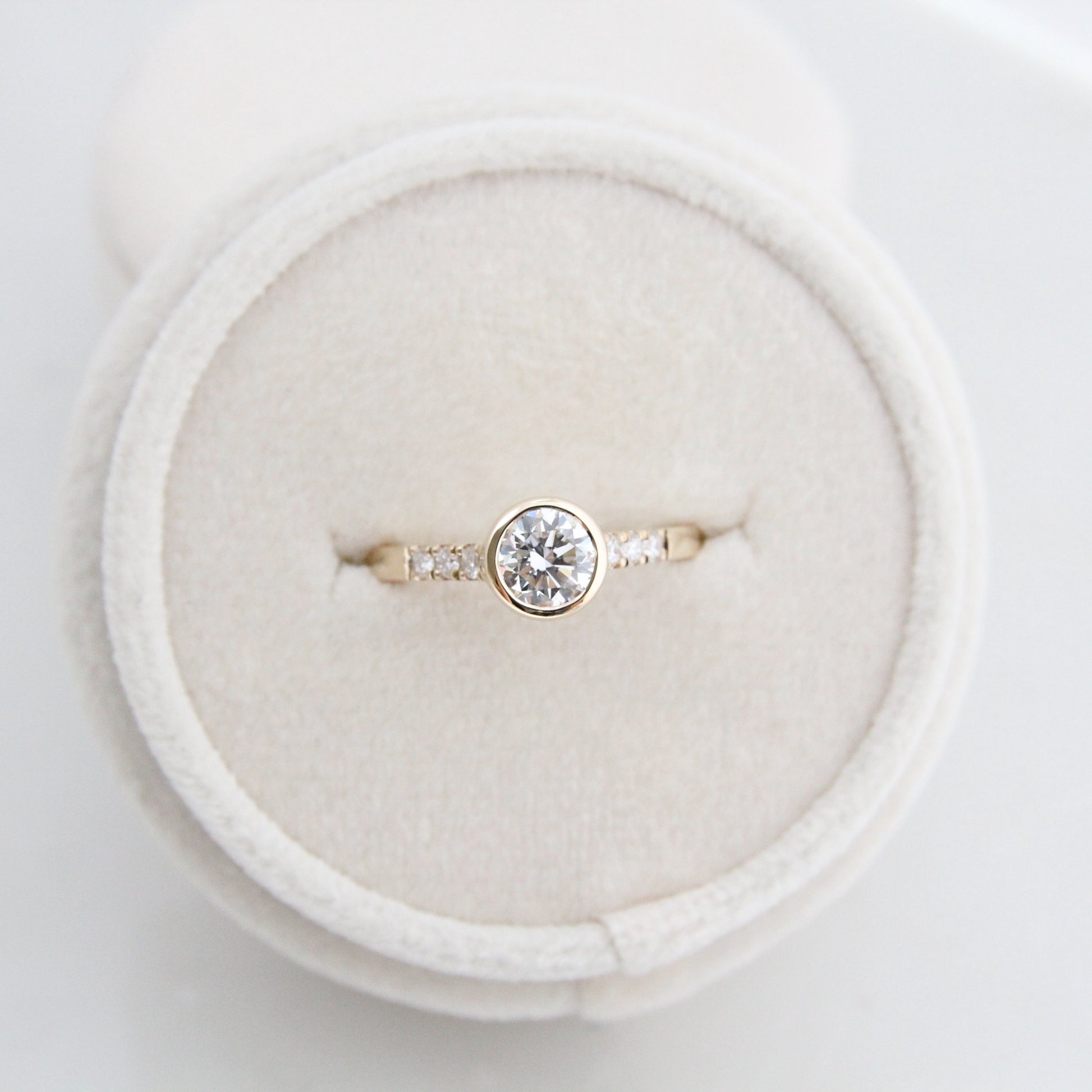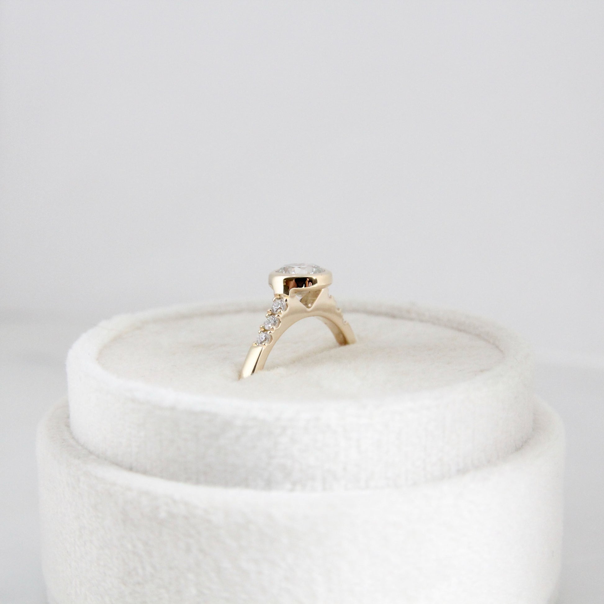 The bezel peak design allows you to view the culet of the diamond as if it's floating. The raised setting can accommodate for a wedding band to sit flush.