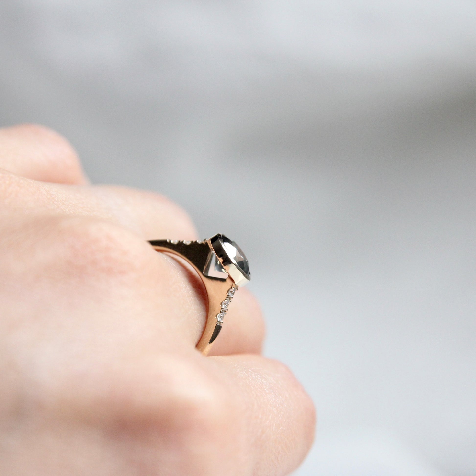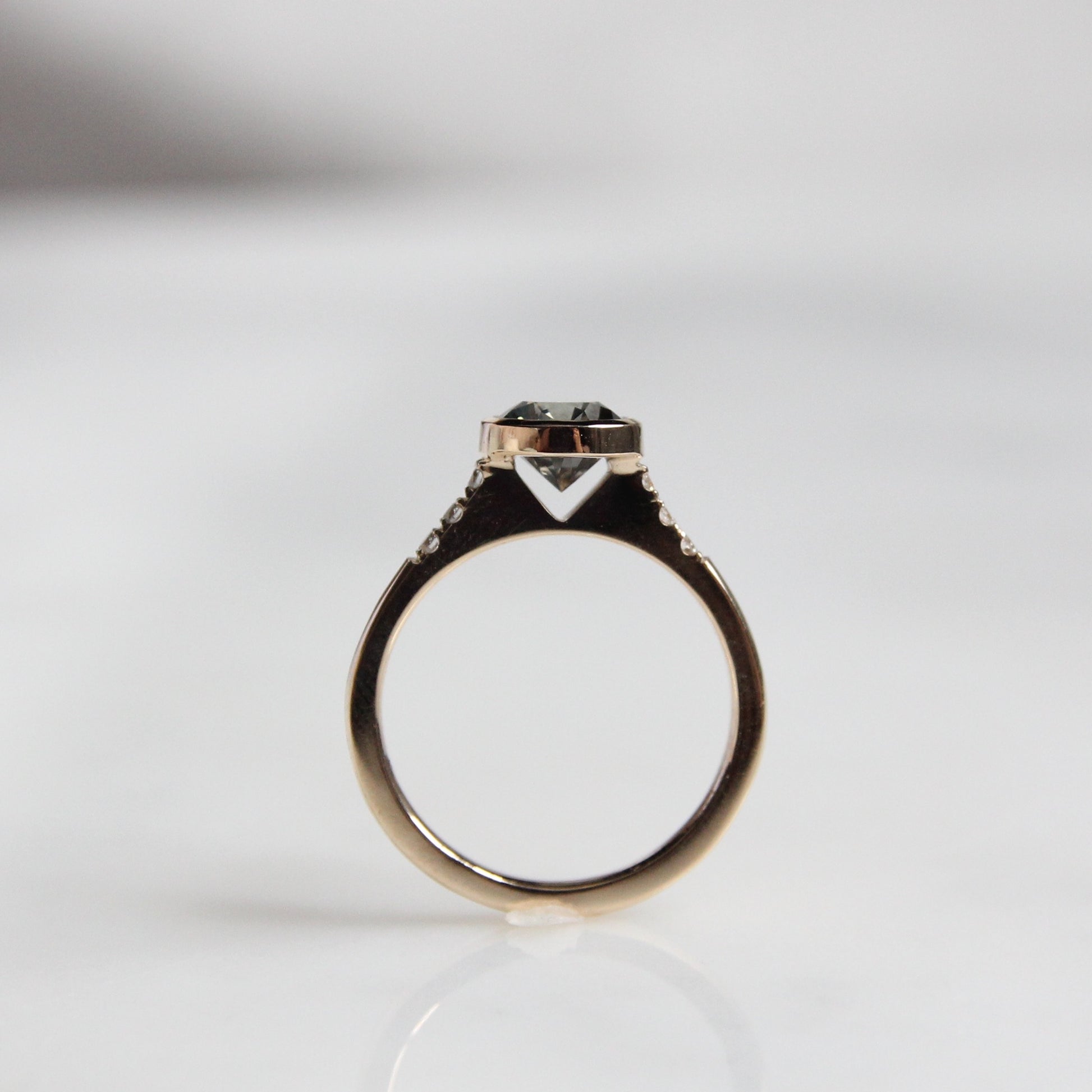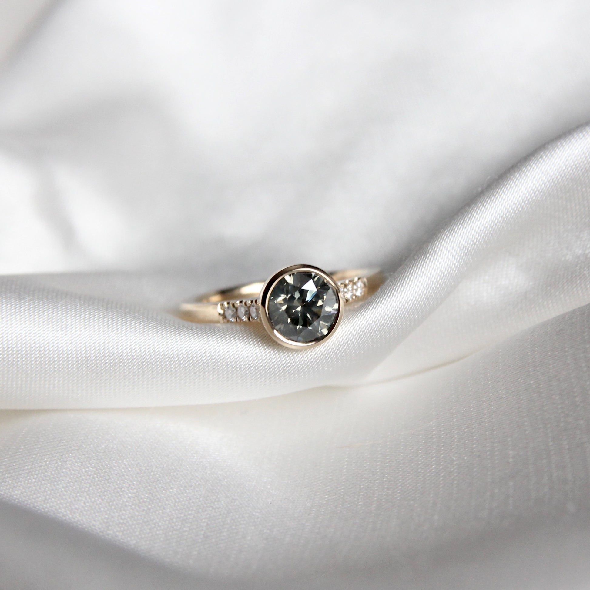 Shown here with a 0.70ct round brilliant cut lab-grown white diamond and a 1ct Fancy grey diamond.