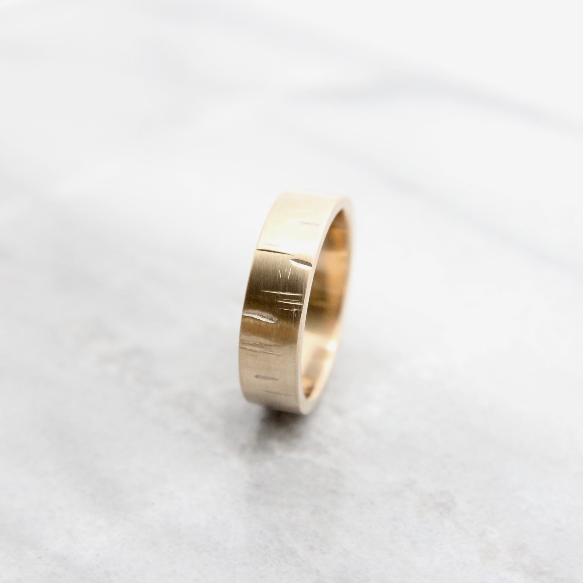 As each one is hand carved and made to order, there may be slight variations in the details than pictured. Made in solid 14k gold with a brushed matte finish. 6mm wide.