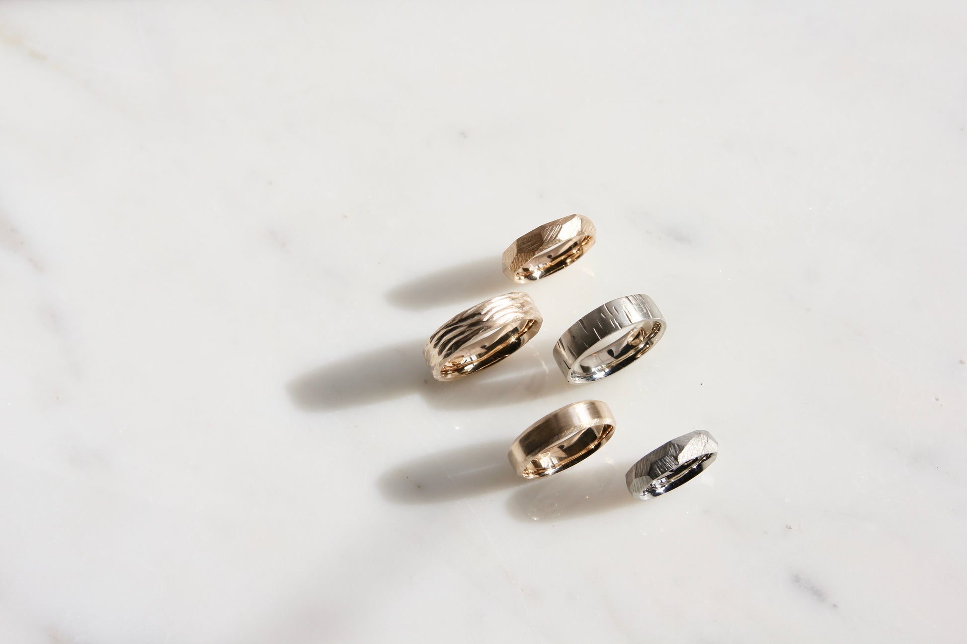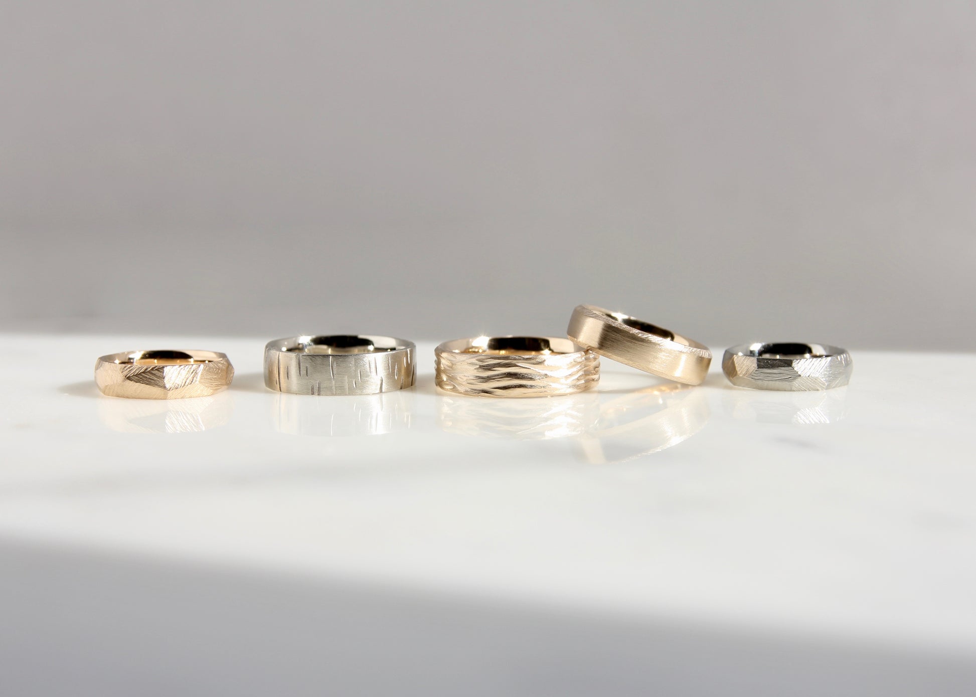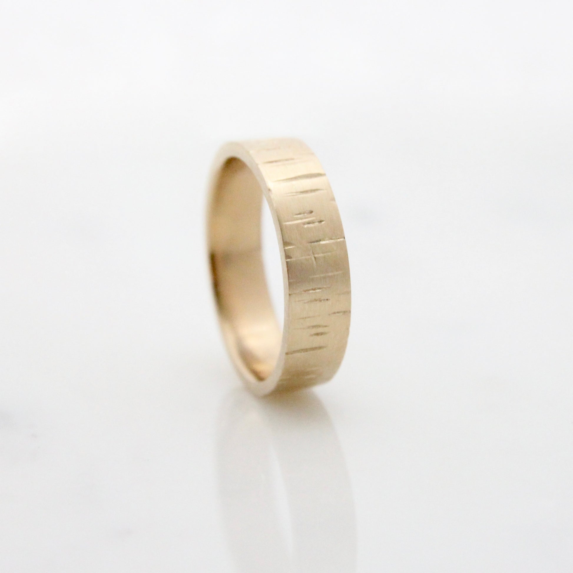 This band's carved and hammered lines was designed in memory of being in the woods surrounded by Birch trees and White Pines in Northern Ontario.