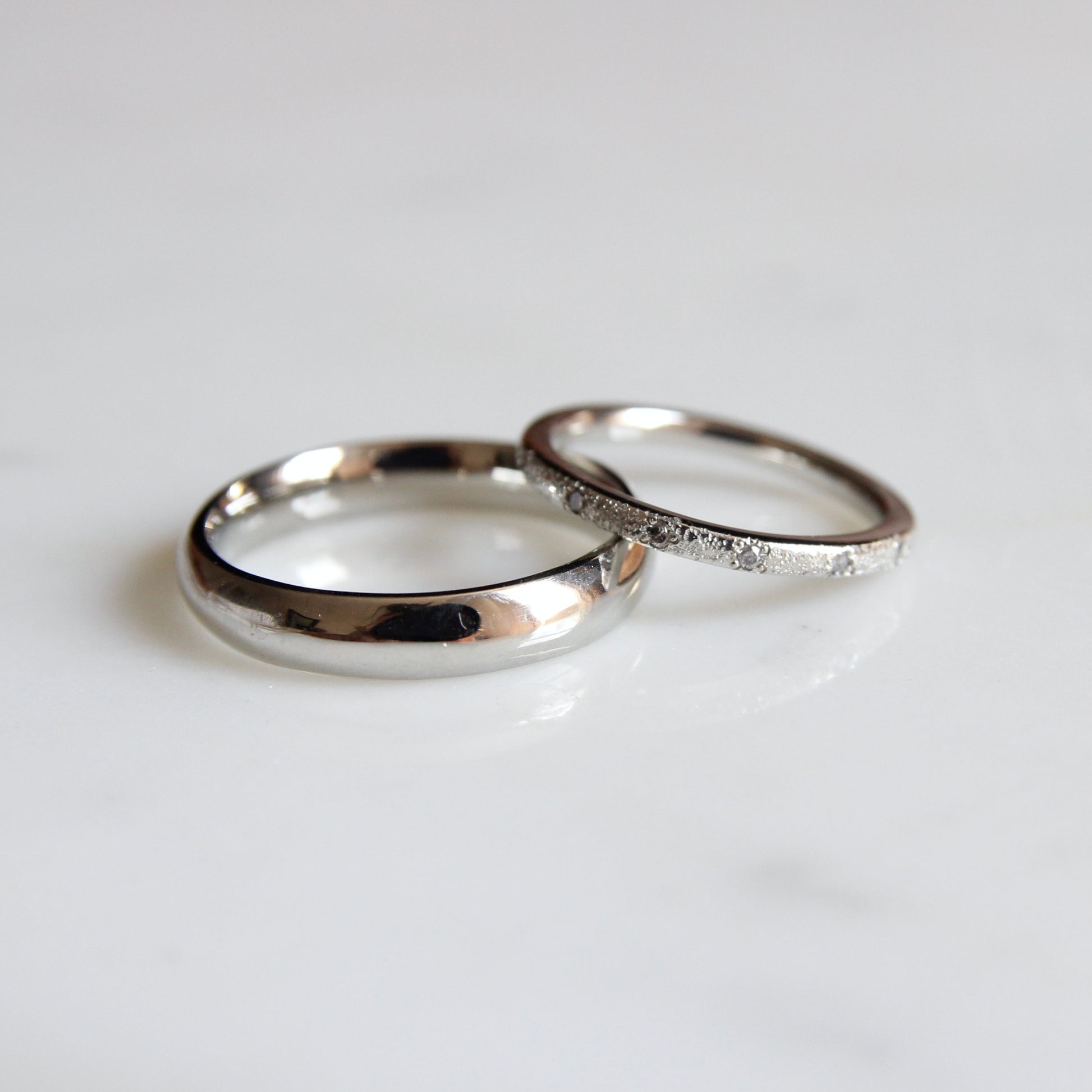 Shown with a custom Cassiopeia 6 diamond stardust band in 14k white gold and a custom 3 diamond wedding band.