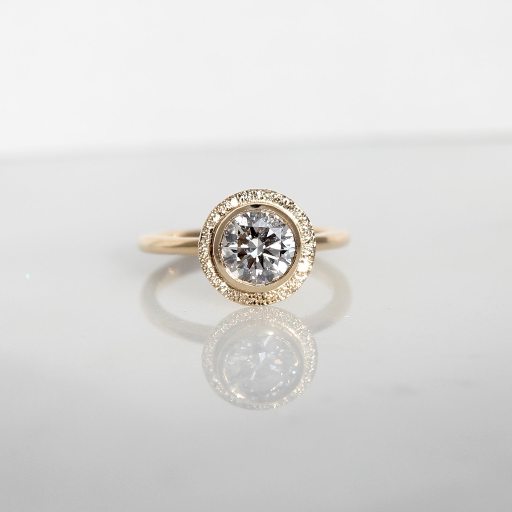 This Stardust halo is our take on a traditional halo. The signature texture adds interest around the bezel set centre stone without the use of additional diamonds.