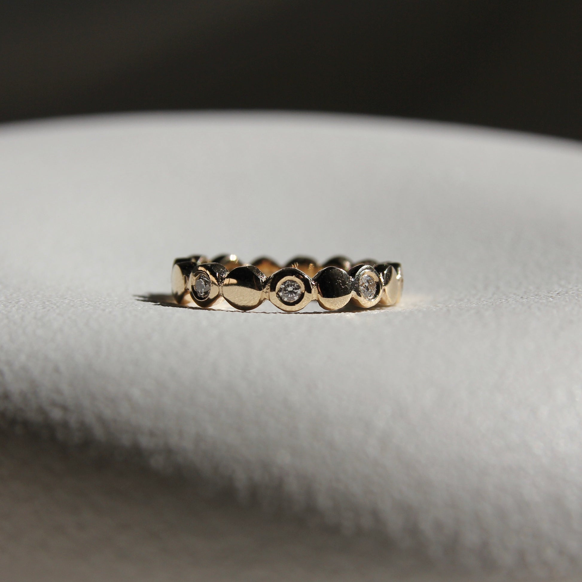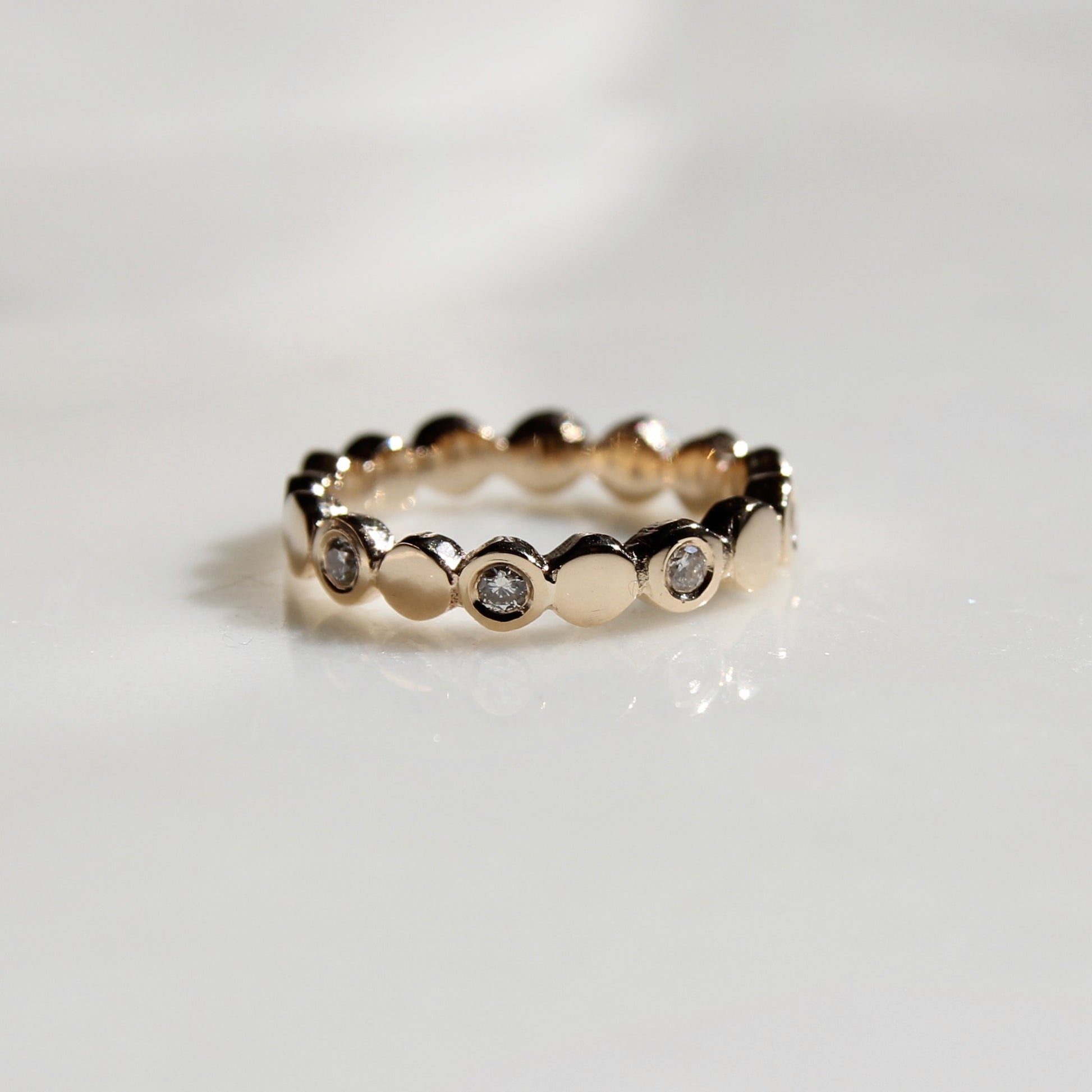 Organically hand carved pebbles with diamonds in every other pebble, set halfway around the band.