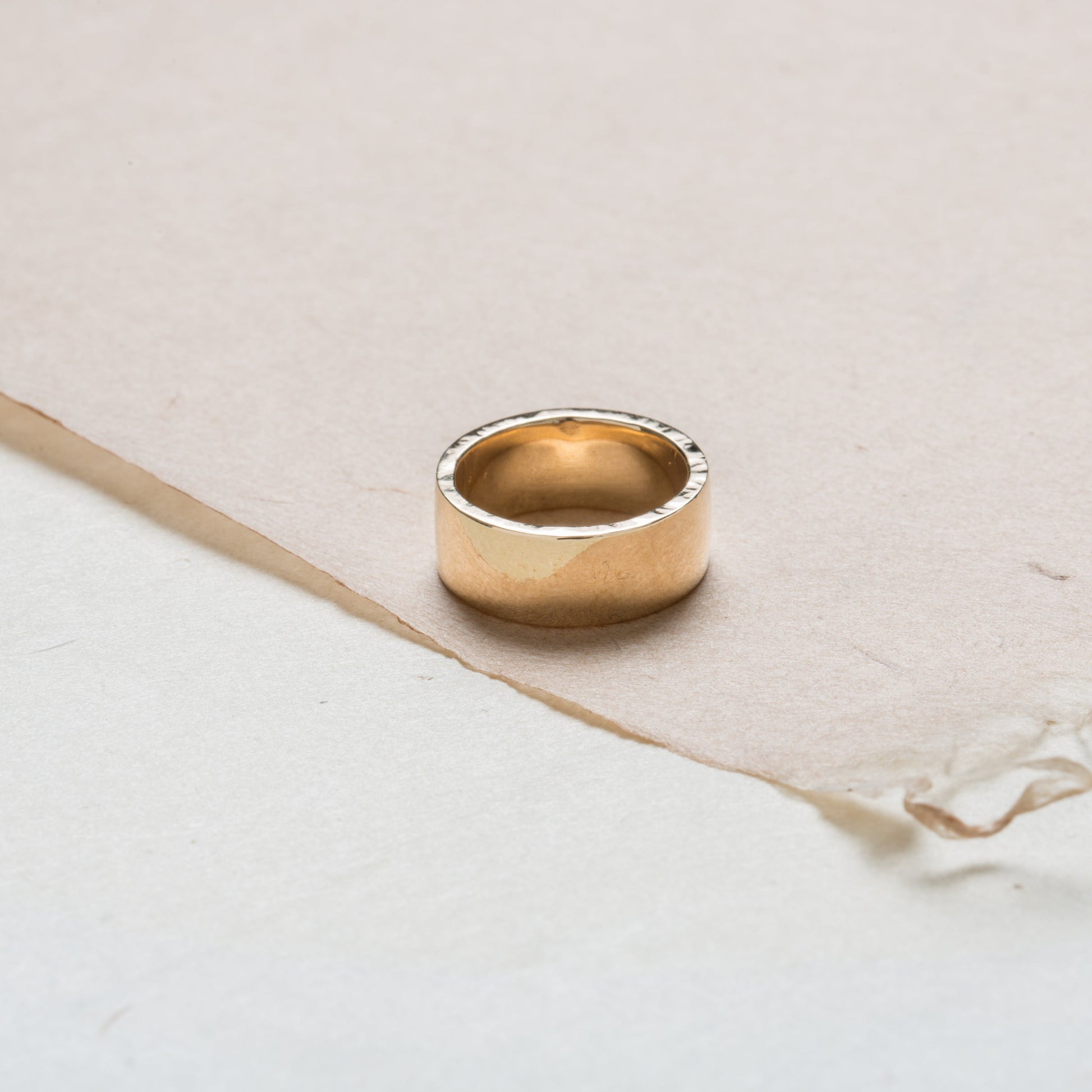 This cigar band is bold with weight to it. 7mm wide, the hammered textured edge is polished so that it catches the light.