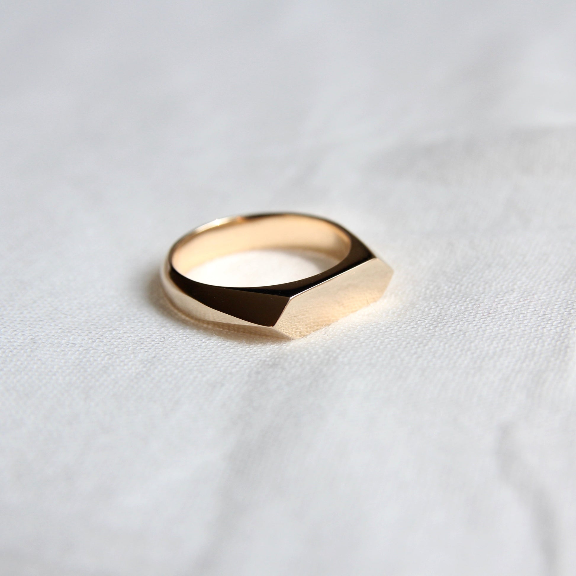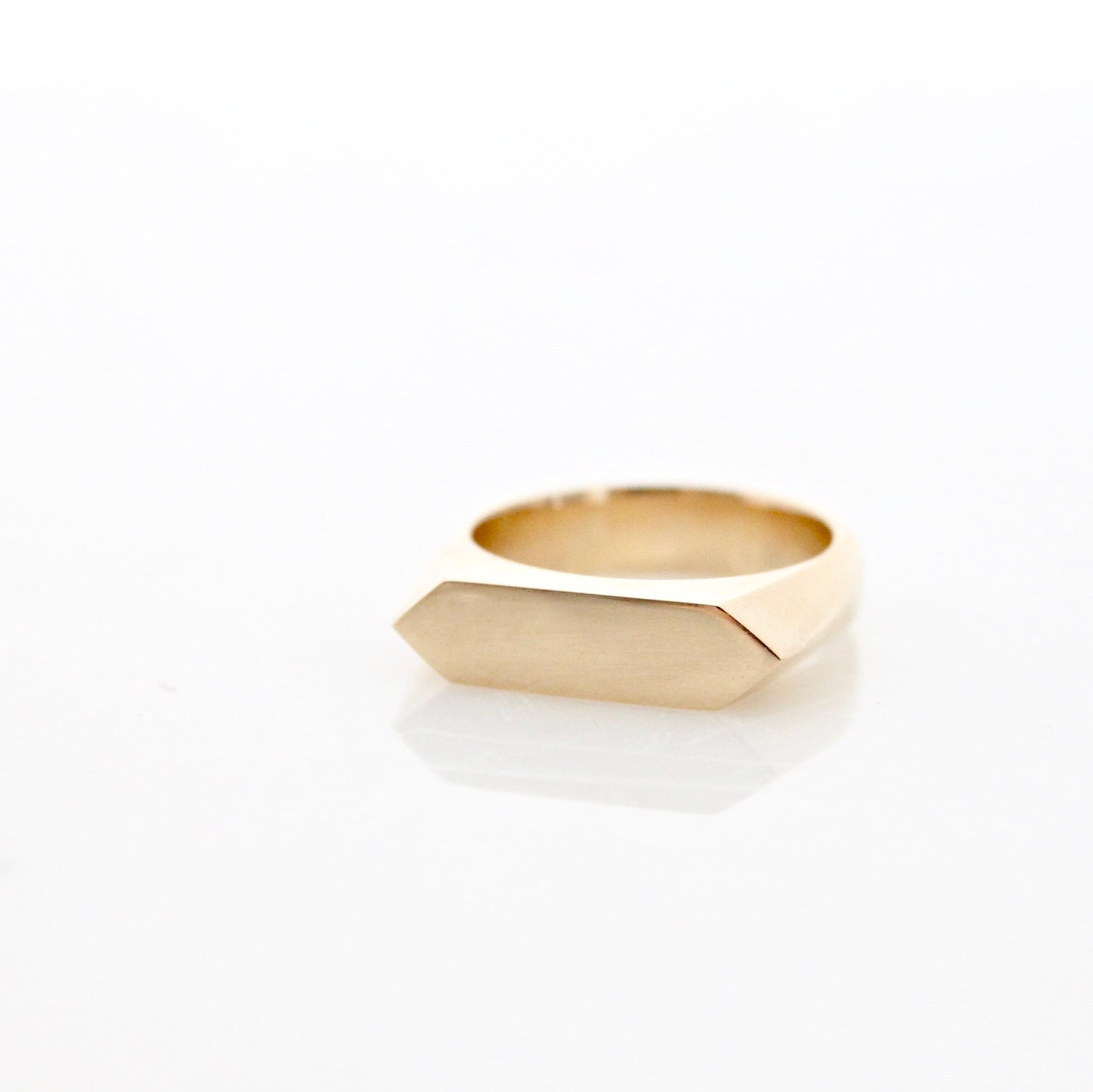 This heavy weight ring is made for anyone. Hand carved with architectural lines and a flat hexagon face. A modern signet ring.