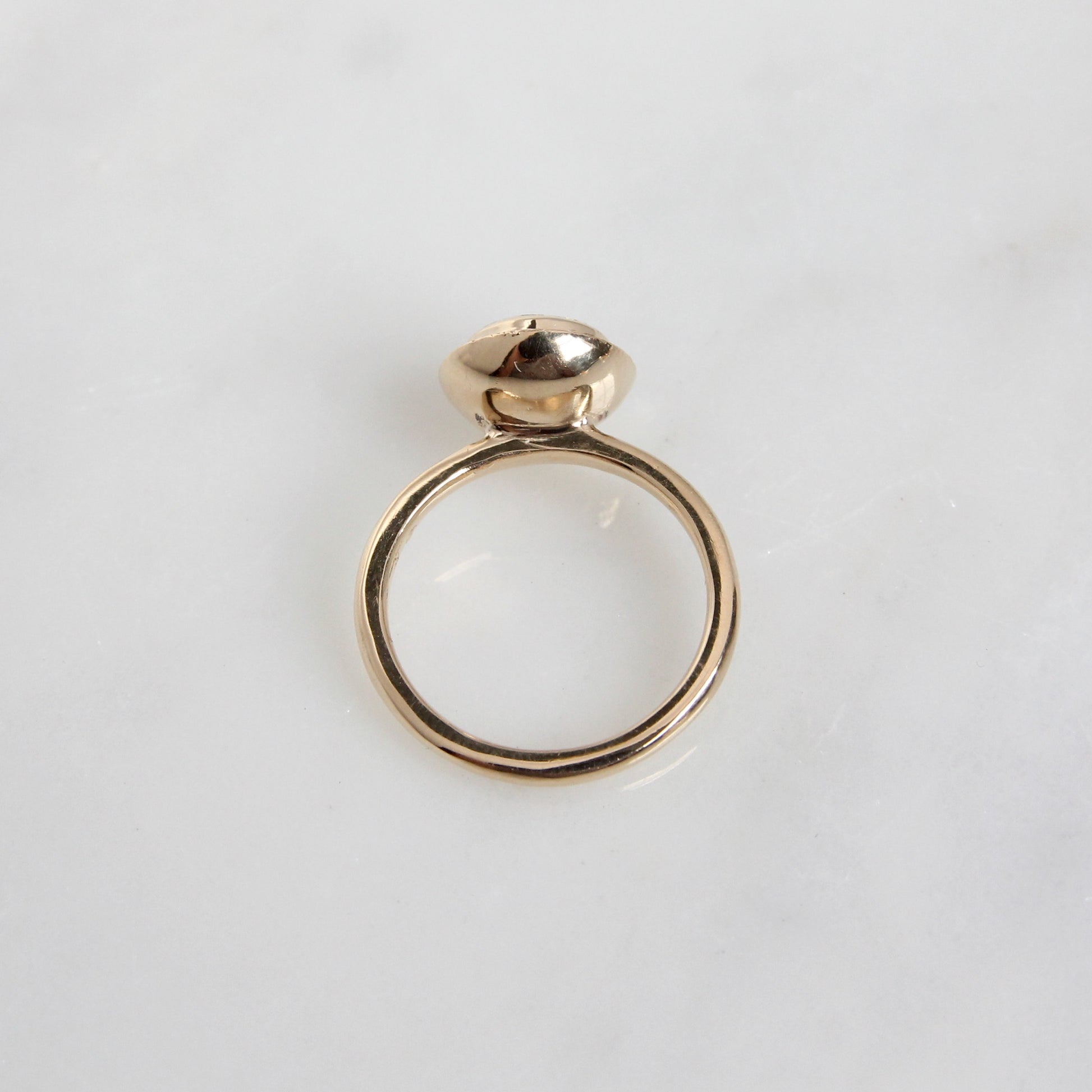 Hand carved and set in 14k yellow gold. This ring is designed to allow for a wedding band to sit flush.