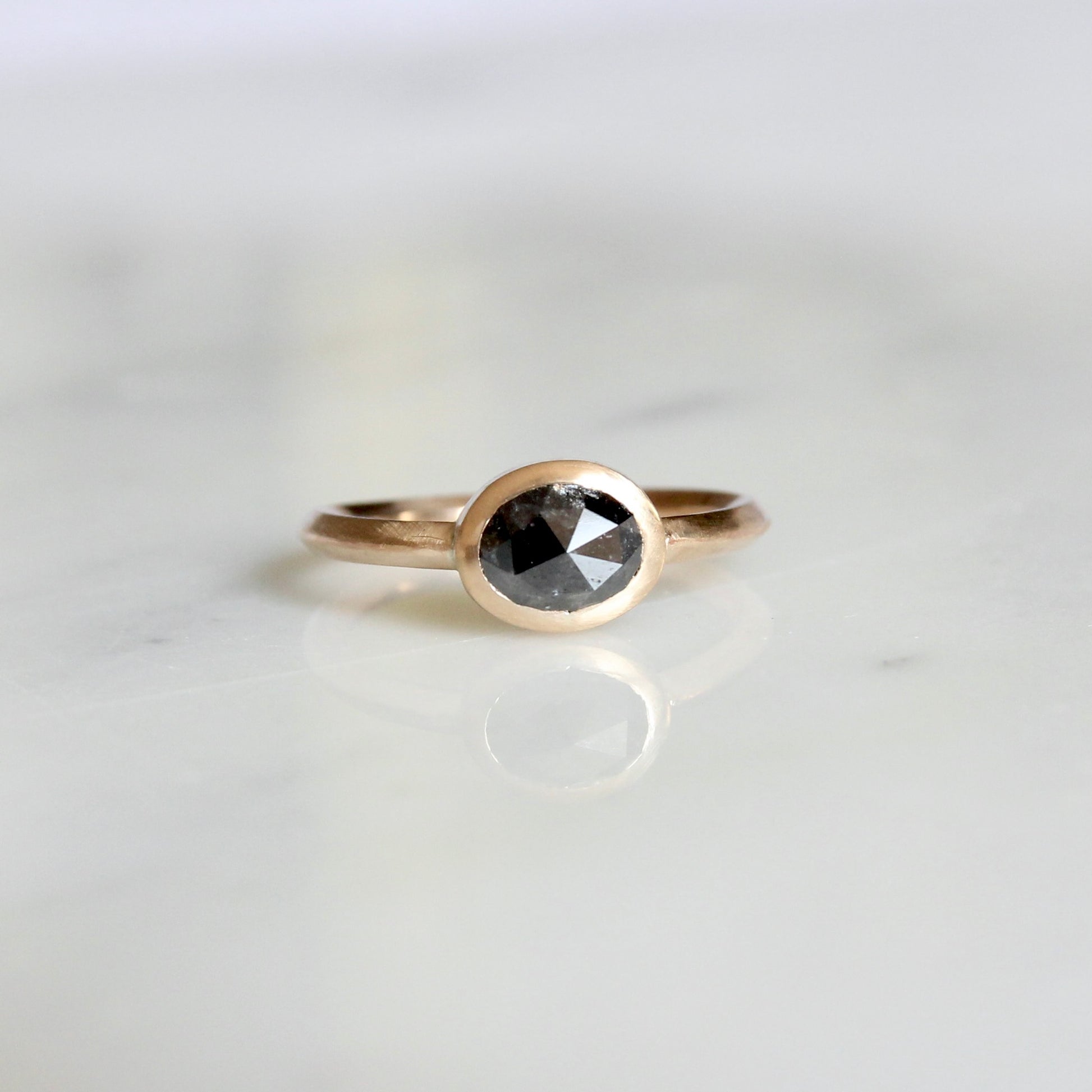This hand fabricated black rosecut diamond beauty is bezel-set in an East-West orientation on a knife edge band.