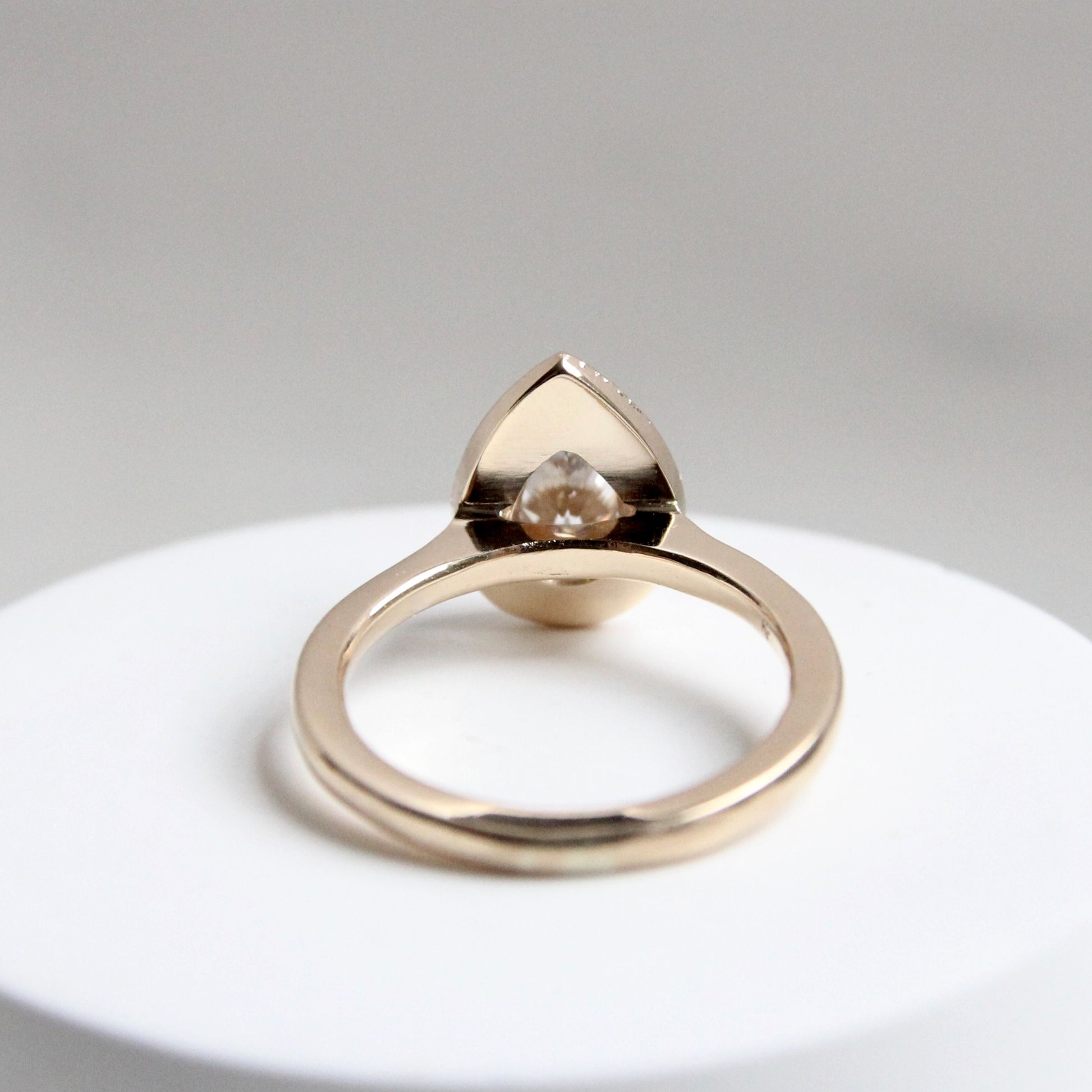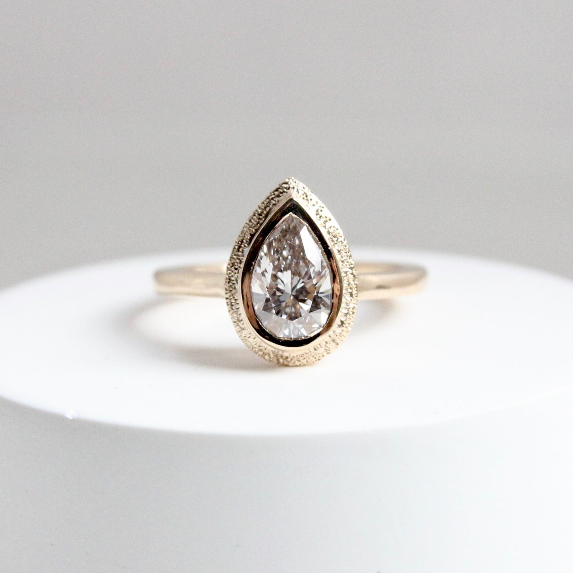 Featuring a 1.08ct VS2 J lab grown diamond. Hand carved and set in 14k yellow gold.