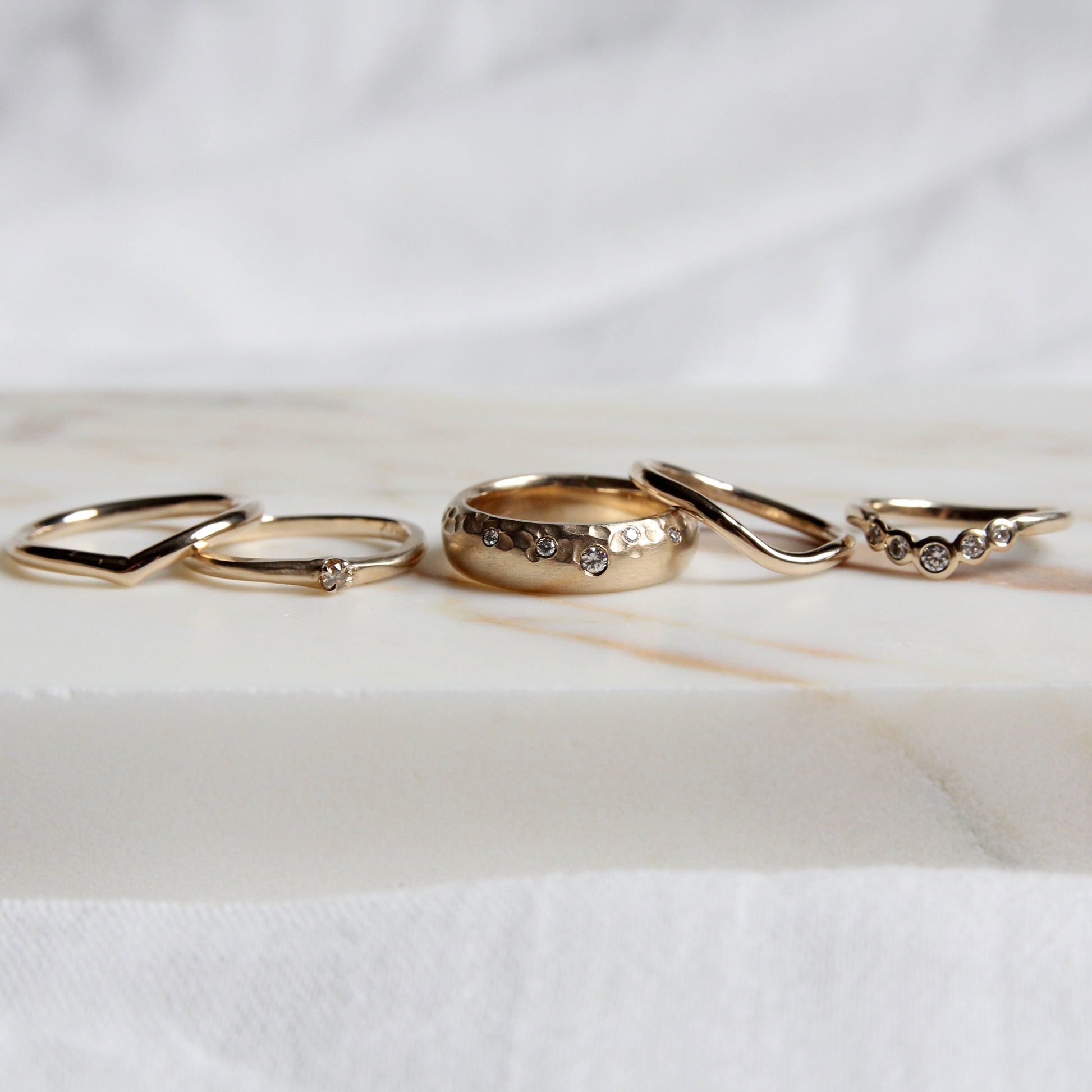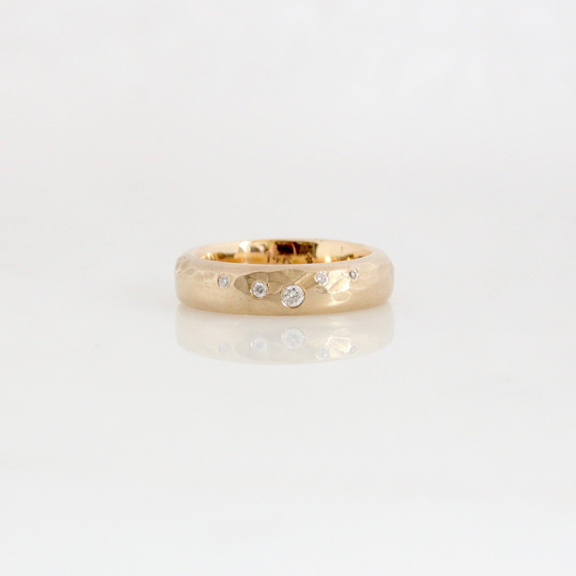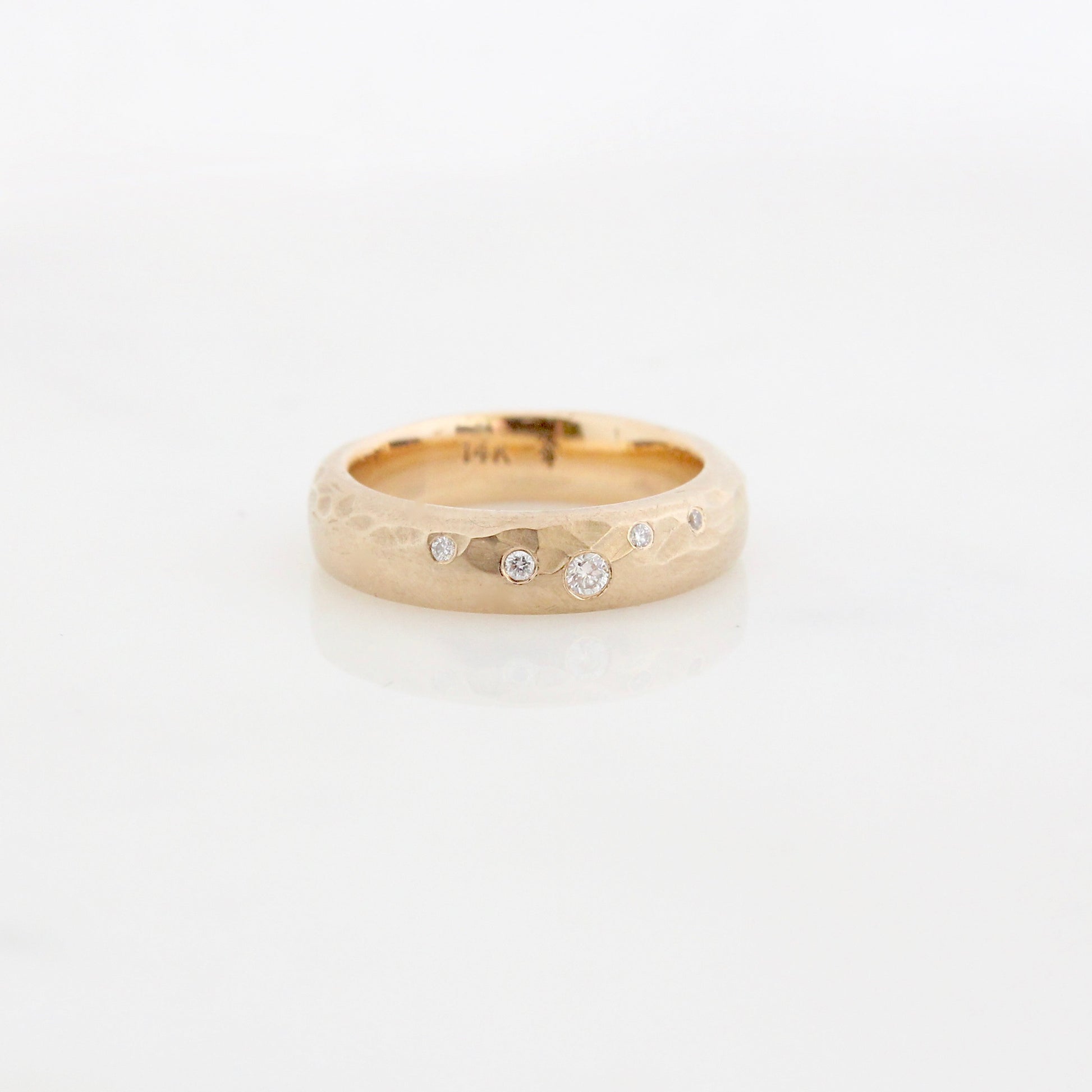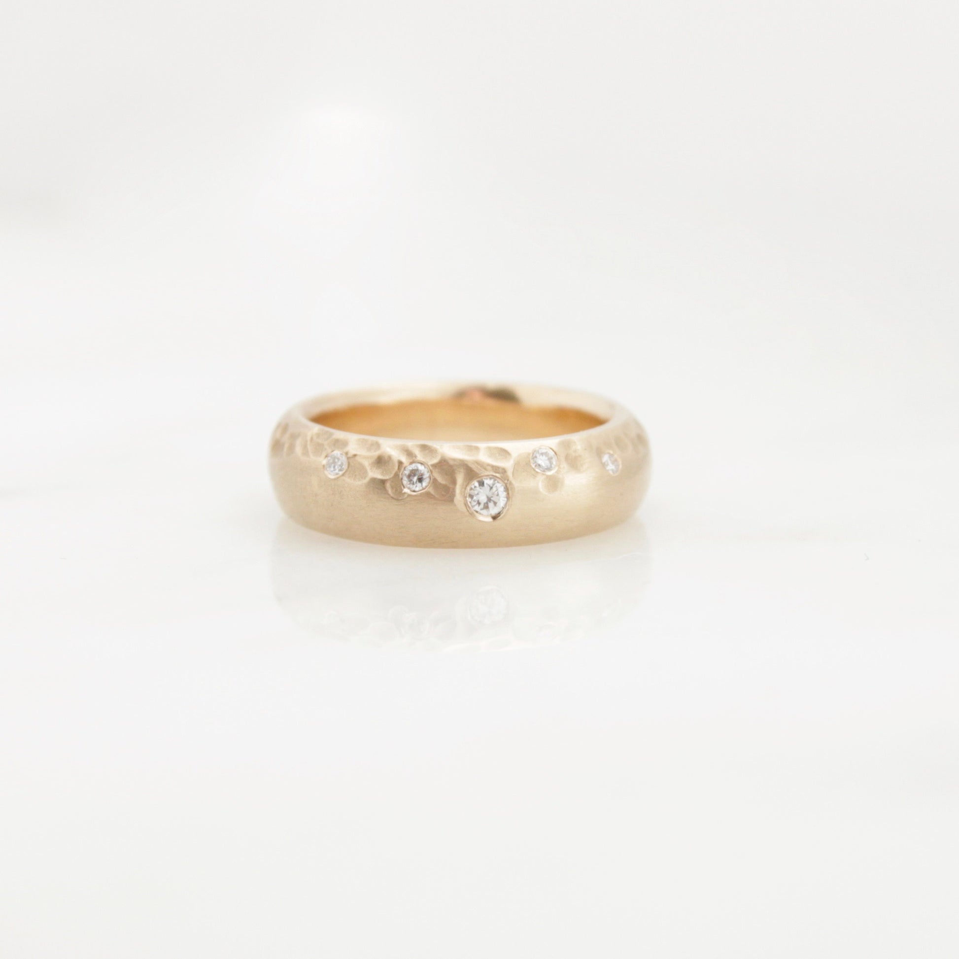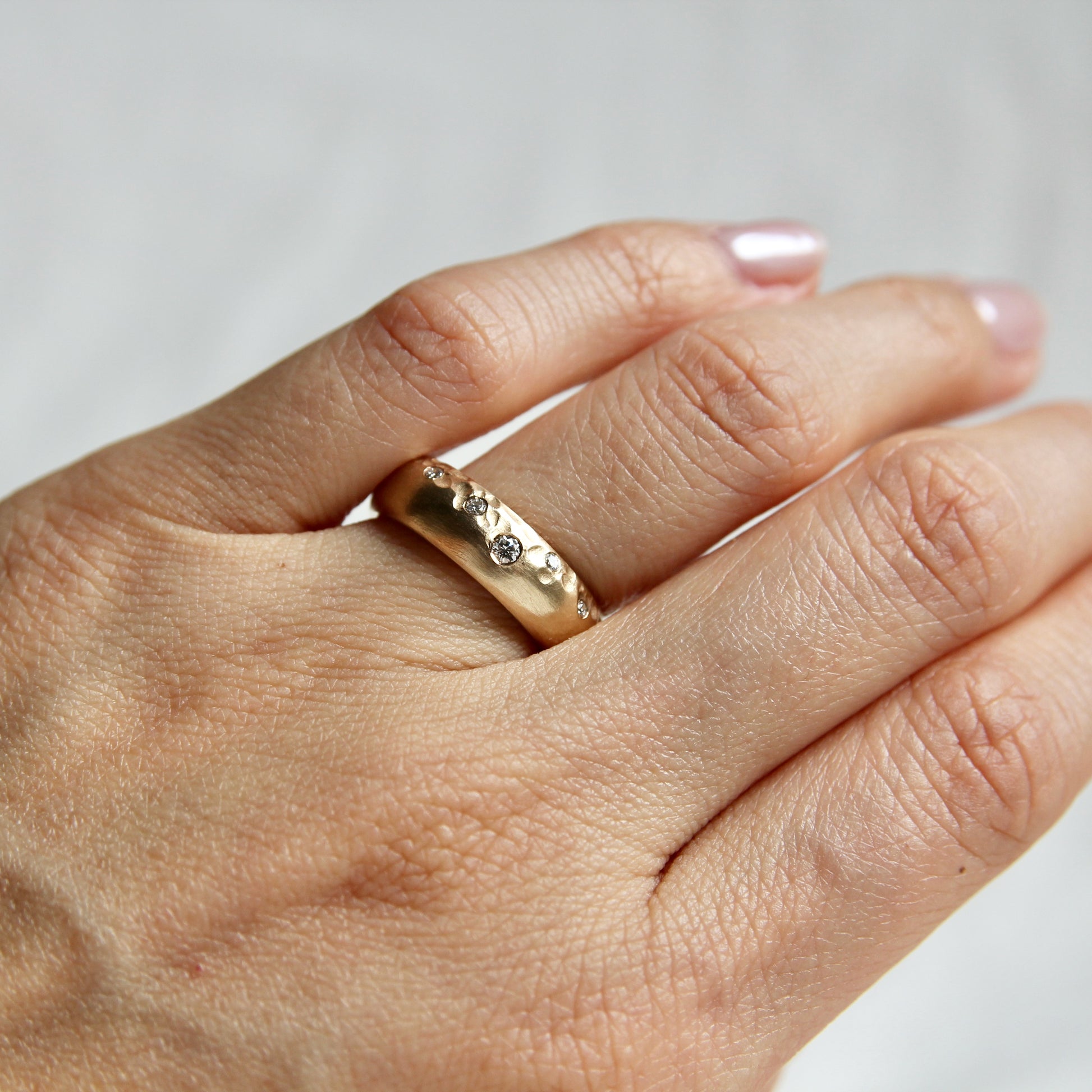This starry night band combines hand carved texture and a scattering of Canadian diamonds to create an organic gold band with flowing texture. As each ring is hand carved and made to order there may be slight differences in details than pictured.