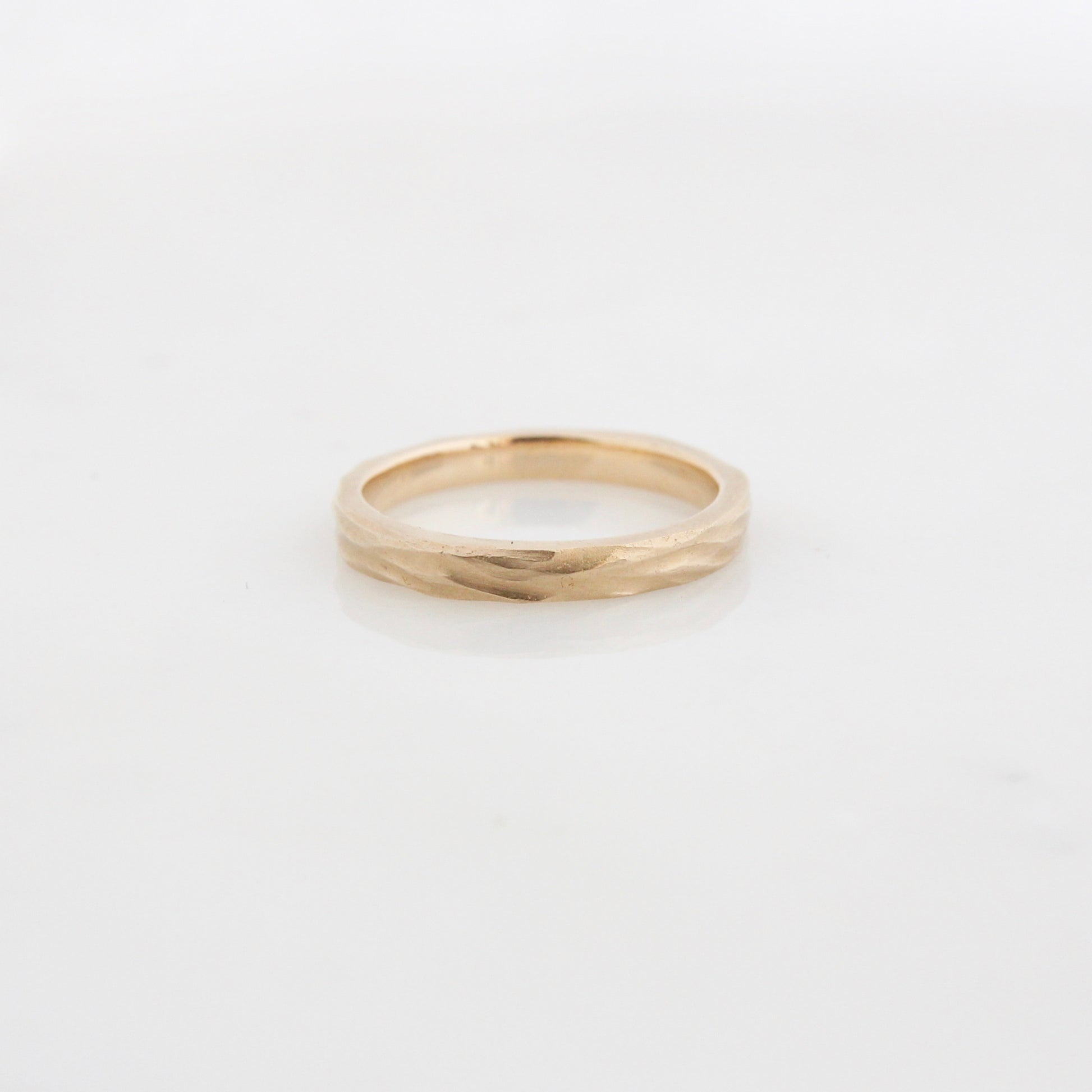 This organic stream band is both smooth and textural. Hand carved and made to order in solid 14k gold. 3.5mm wide with a comfort fit interior.