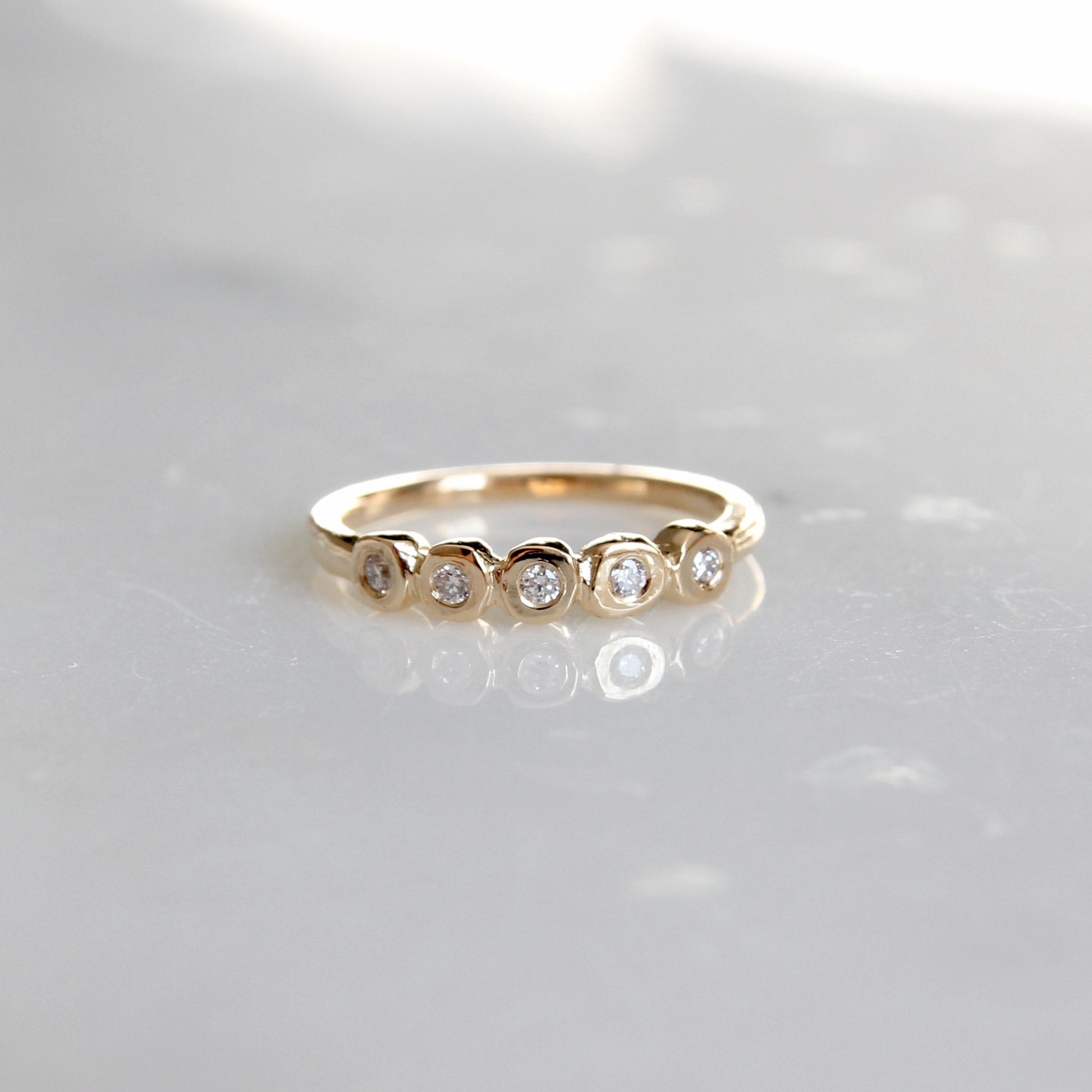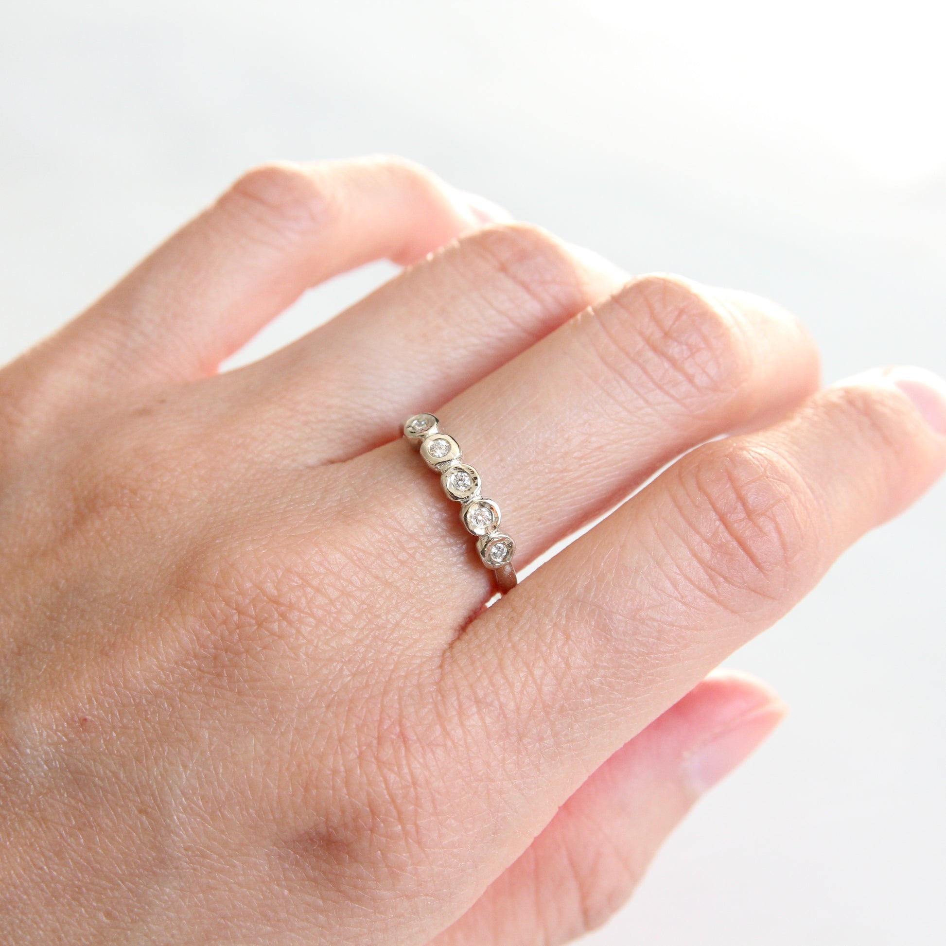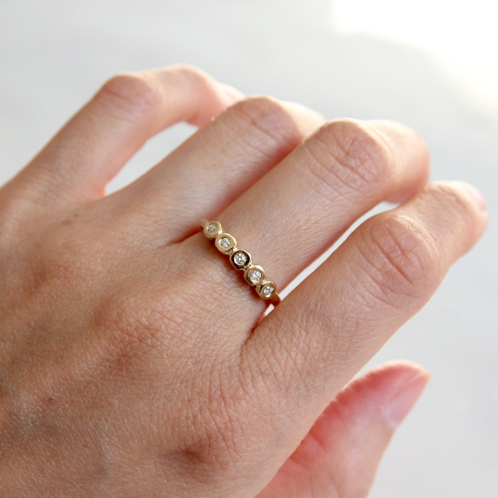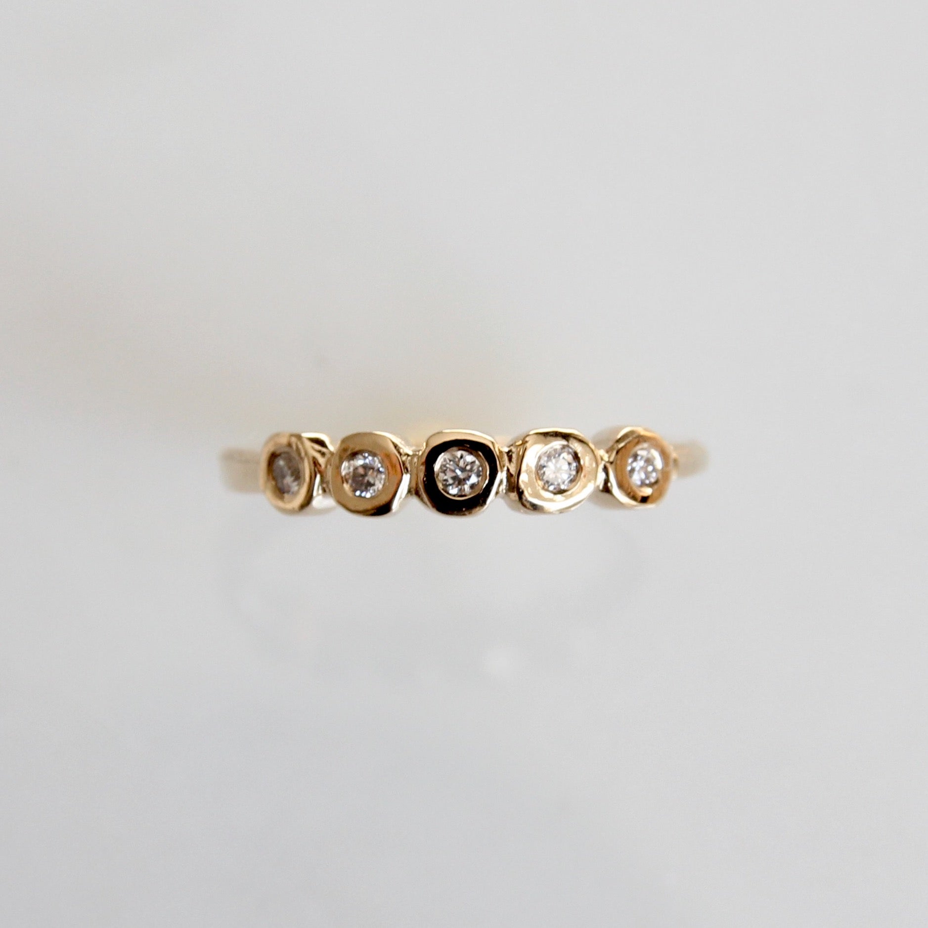 A tiny white diamond version of our organic diamond bezel band. Five Canadian round brilliant cut diamonds (VS/G) are set in organically carved bezels with a solid gold band.