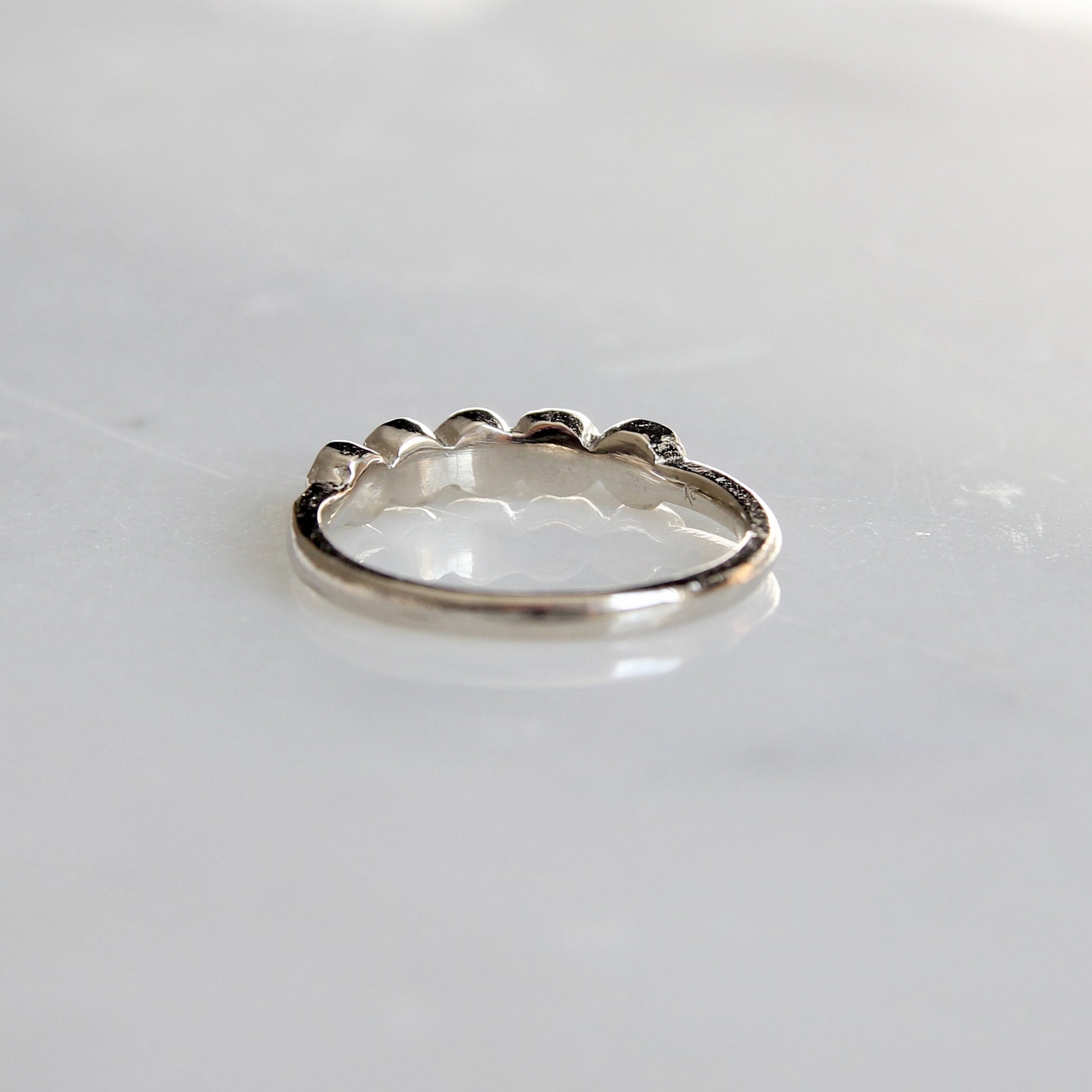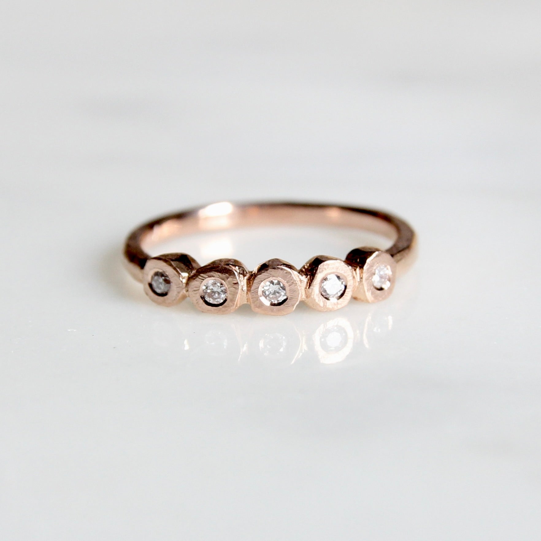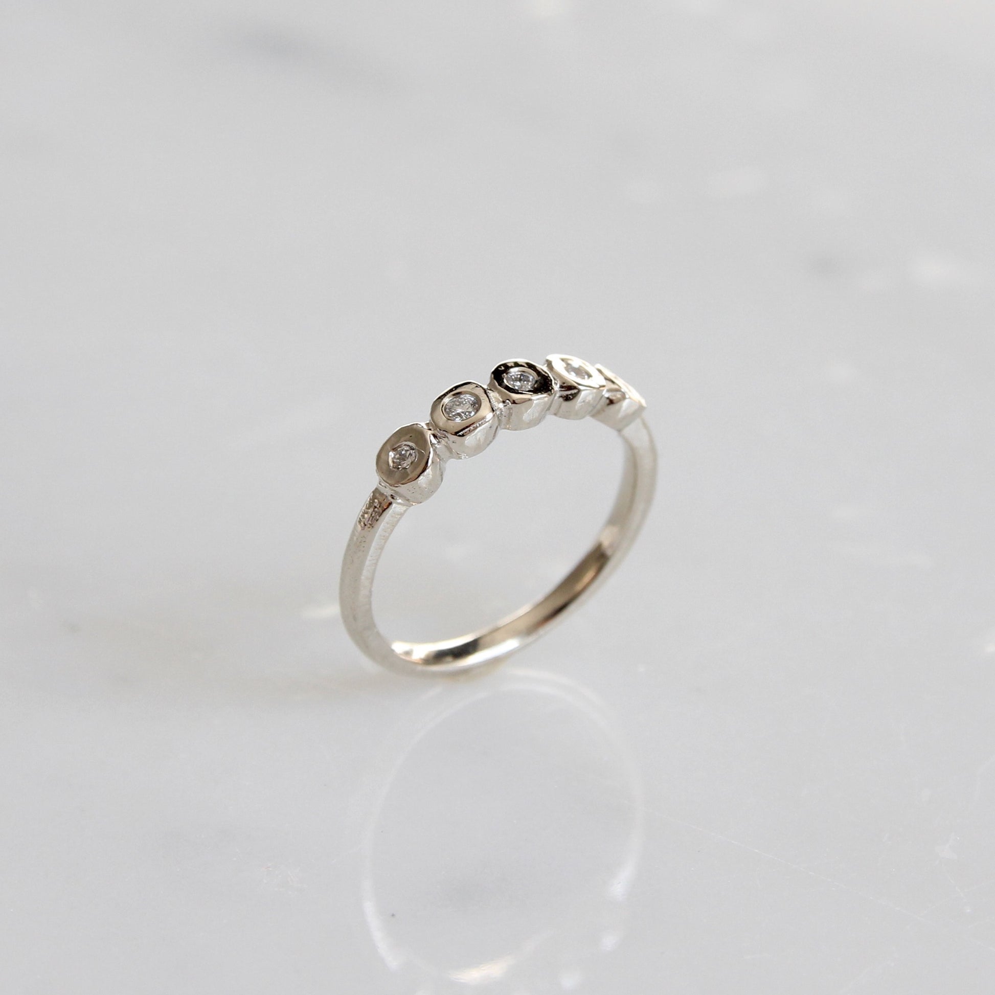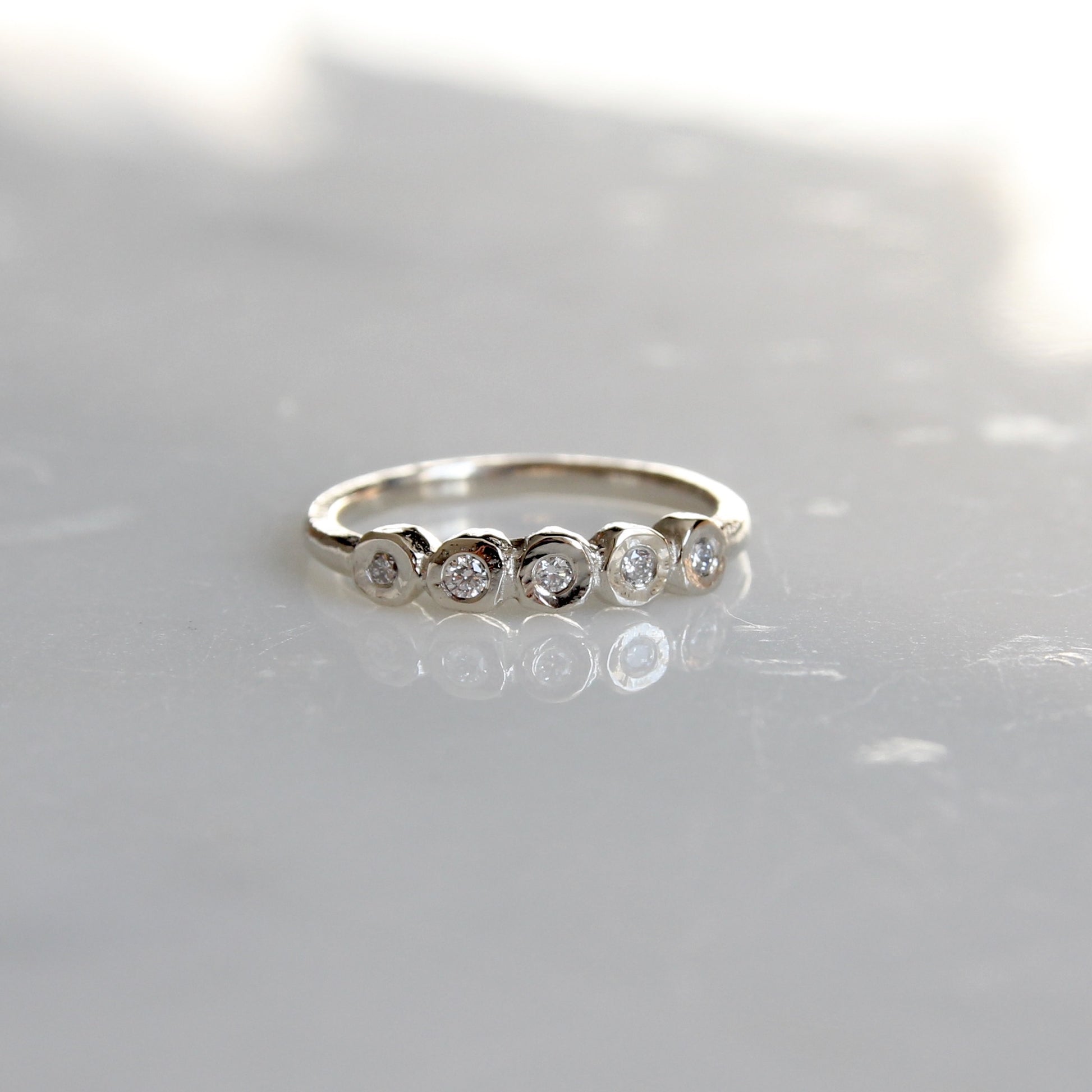 A tiny white diamond version of our organic diamond bezel band. Five Canadian round brilliant cut diamonds (VS/G) are set in organically carved bezels with a solid gold band.