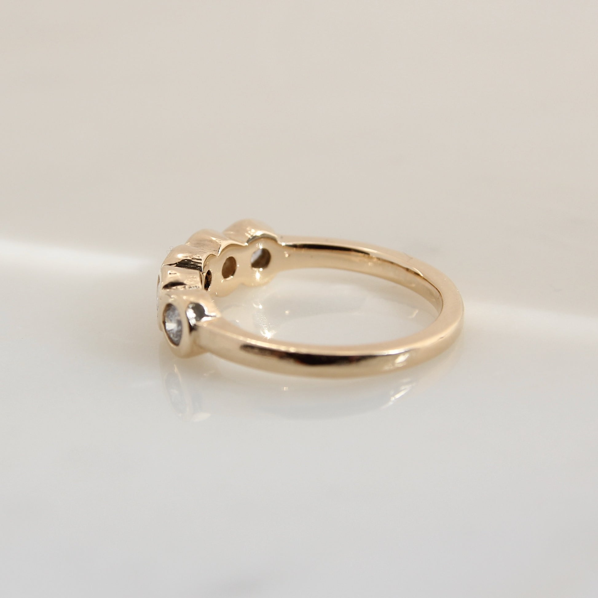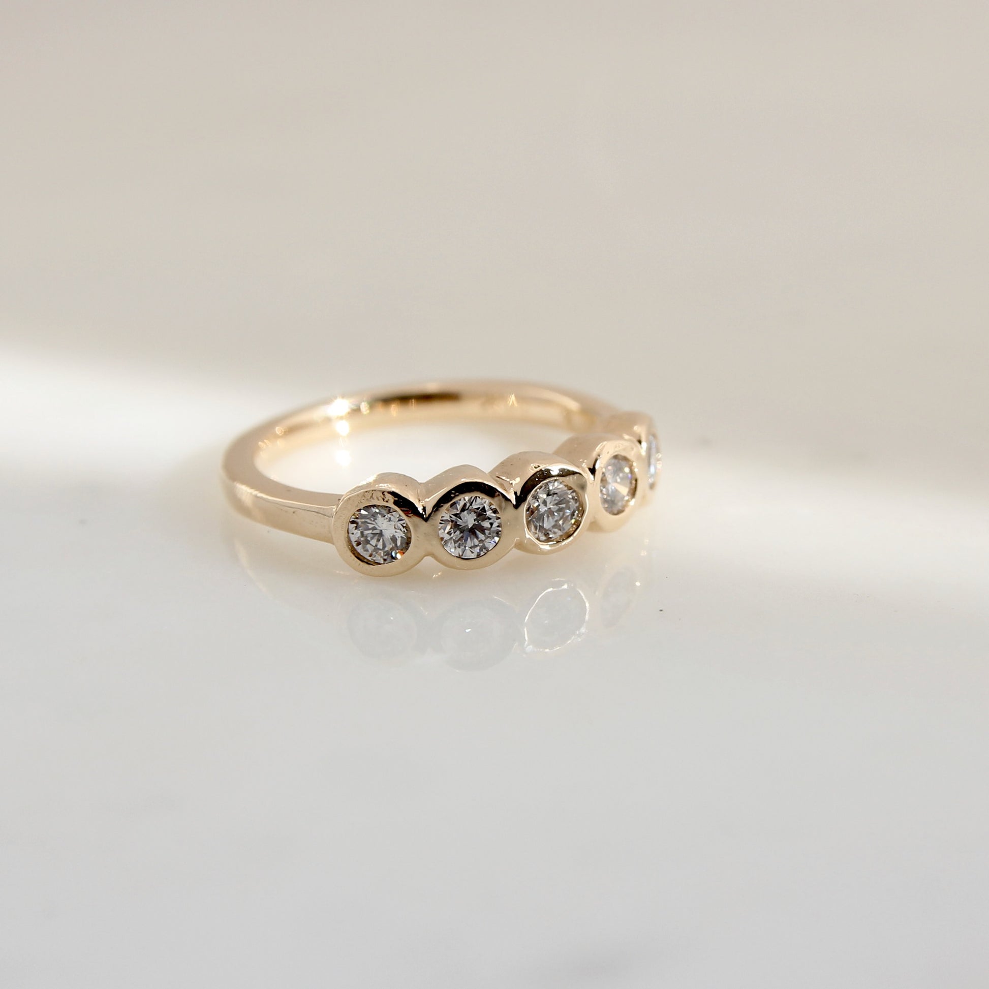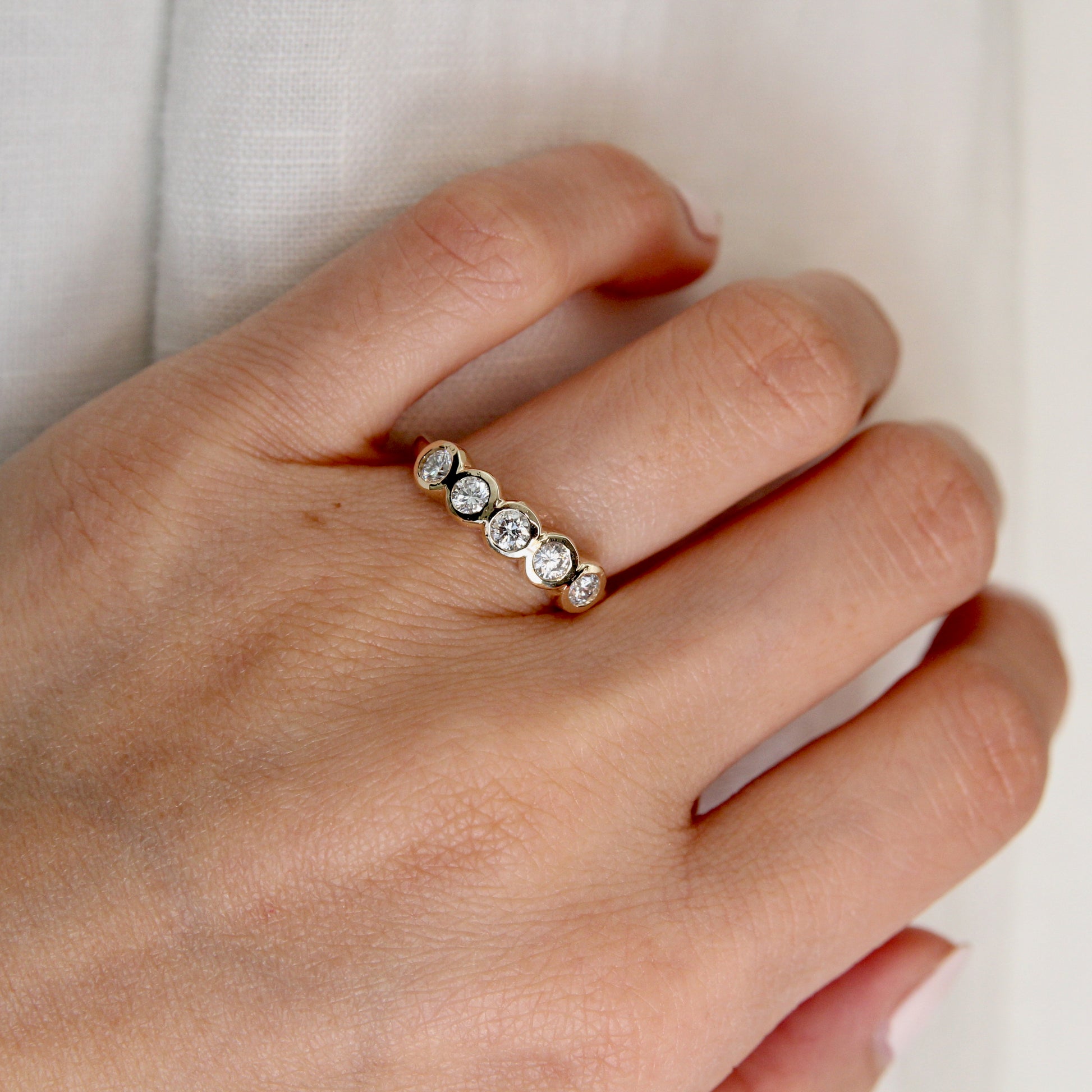 This band is anything but ordinary. Five 3mm round brilliant cut Canadian diamonds are set in organically carved bezels with a solid gold band.