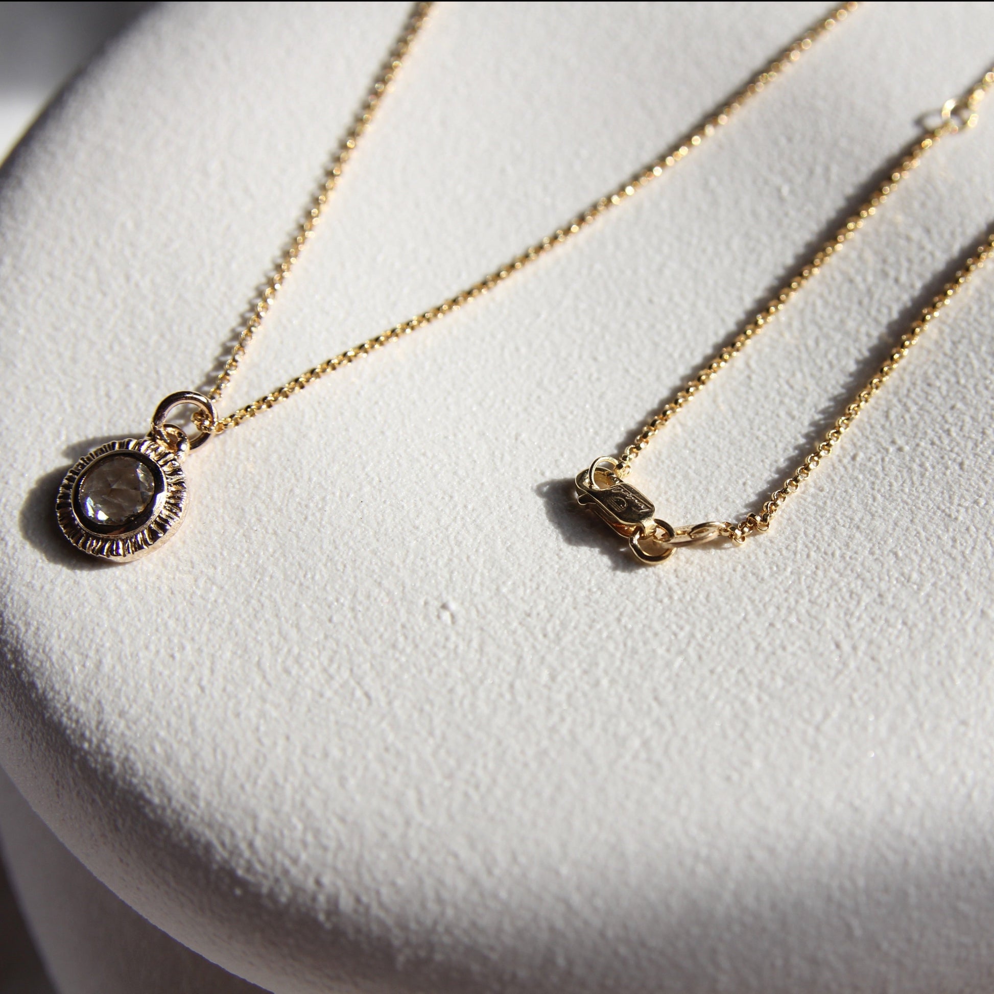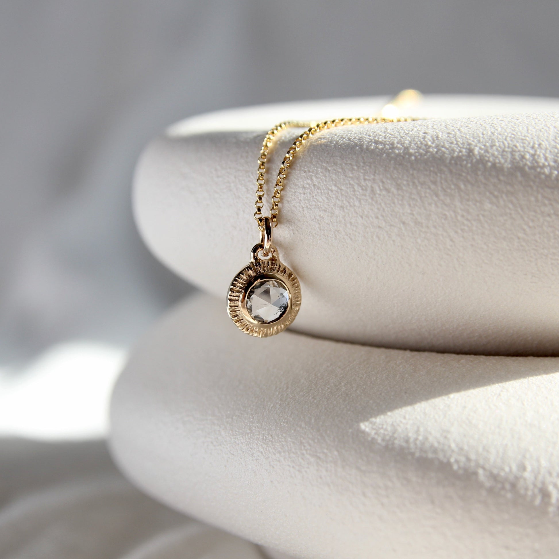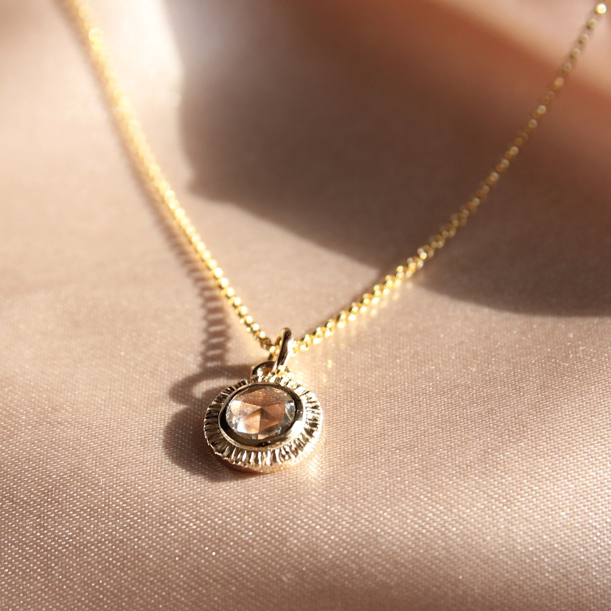 This clear rosecut sapphire is bezel set in Nicola's signature Rays Halo design.